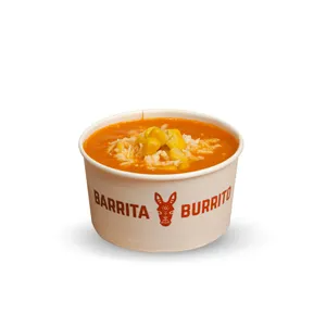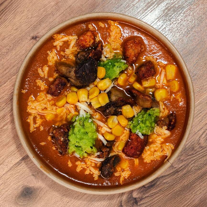 Sopa de tomates asados con 1 proteína a tu gusto, 3 ingredientes de nuestra barra a tu elección y nachos como acompañante.