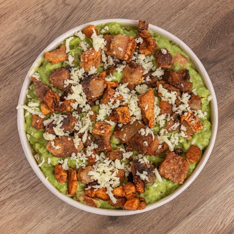 Delicioso guacamole, cubierto con chicharrón crocante, madurito y queso.