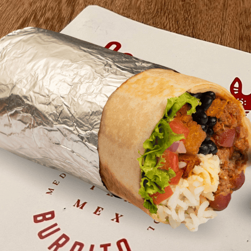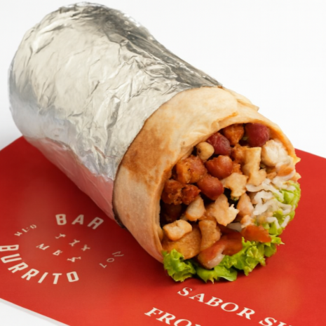 Burrito en tortilla de 25 cm con chili con carne más pollo, guacamole, queso, arroz, madurito, pico de gallo, lechuga y una salsa.