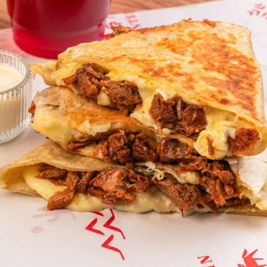 Tortilla de 25 cm, rellena de mucho queso, una proteína a tu gusto, sour cream, guacamole y pico de gallo.