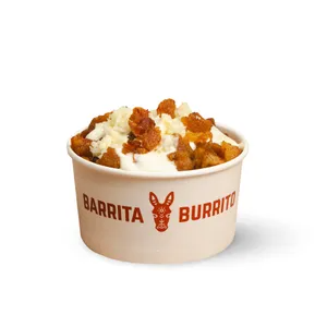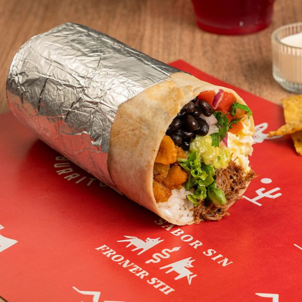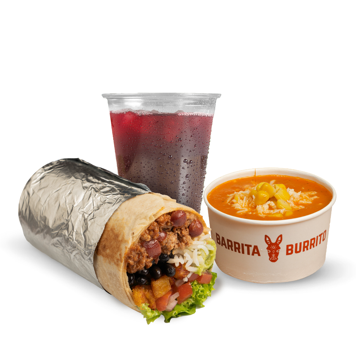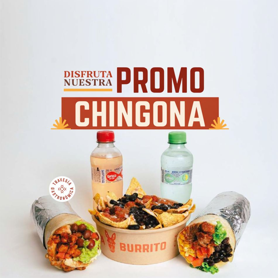 1 Burrito con tu proteína favorita (chili, pollo o costilla), preparado con todos los ingredientes de nuestra barra. acompañado de crujientes flautas en una cama de guacamole, queso, sour cream y mayochipotle, más 1 bebida de 250 ml.