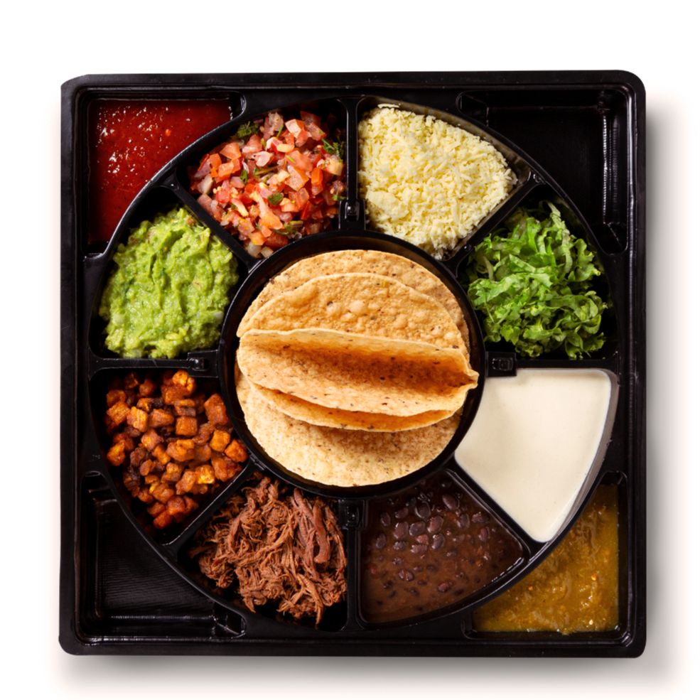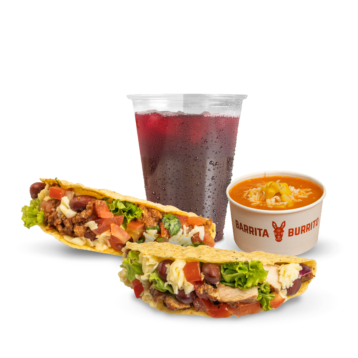 2 Tacos blandos con 1 proteína, 3 ingredientes de la barra, 1 salsa, 1 acompañamiento y bebida a elección.