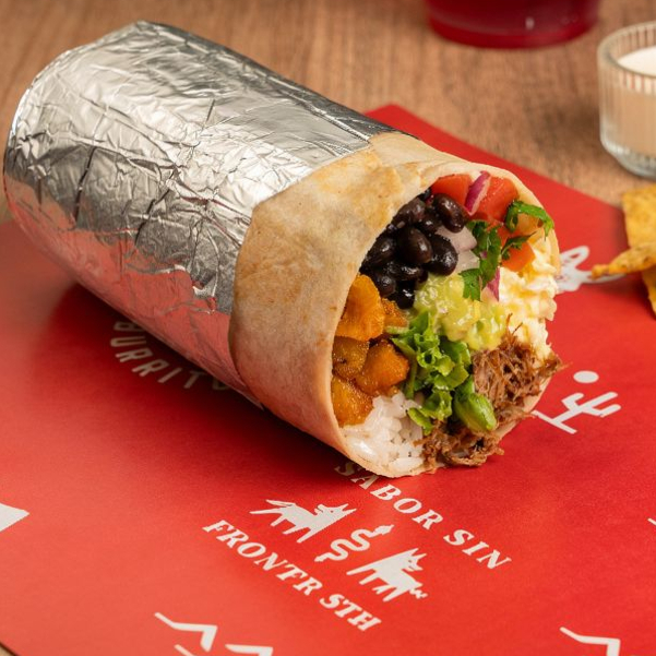 Burro en tortilla de 30 cm de diámetro, con proteína de chili con carne, arroz, fríjol negro (dulce), madurito, pico de gallo, queso, lechuga y 2 salsas a elección.