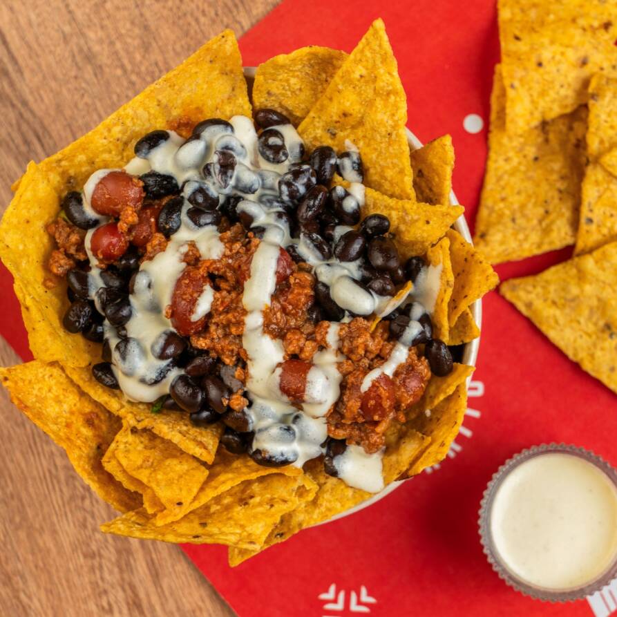 Nachos de maíz crujientes con chili con carne (contiene frijol), sour cream, mayo chipotle y frijol dulce.