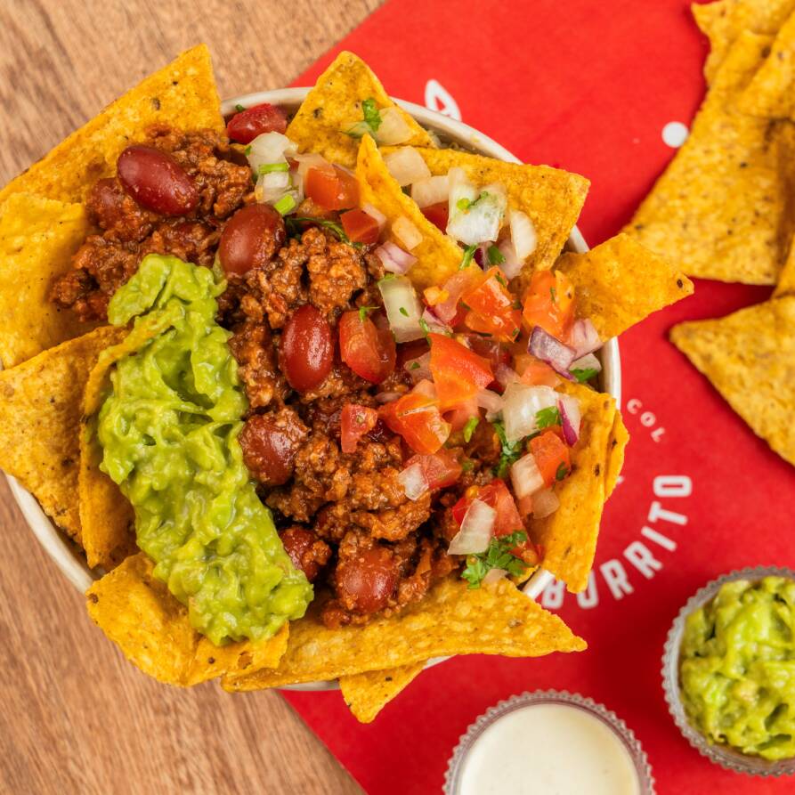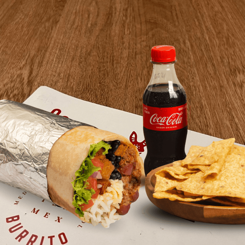 Burro en tortilla de 30 cm con arroz, proteína de chili con carne, frijol, madurito, pico de gallo, queso, lechuga y salsa, acompañado de bebida y nachos con guacamole.