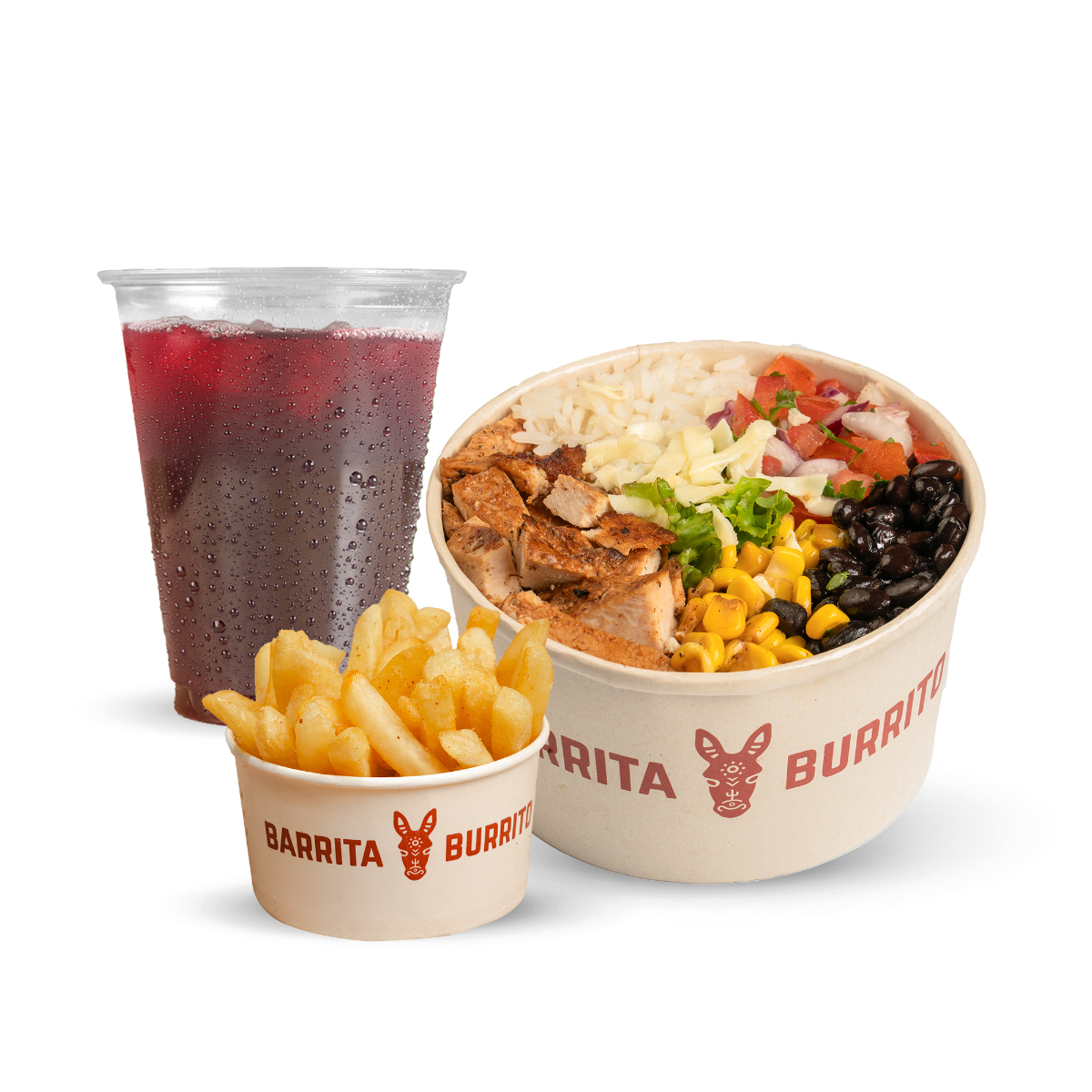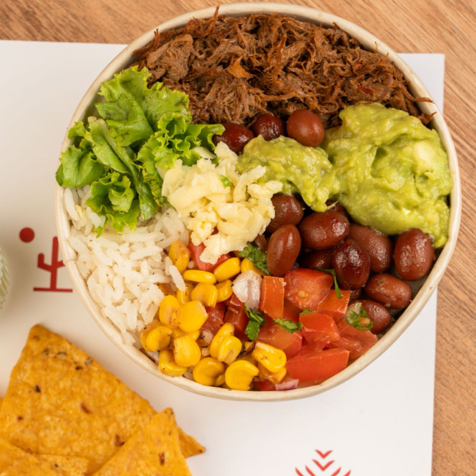 Bowl armado a tu gusto con 1 proteína, todos los ingredientes de nuestra barra, nachos como acompañante y bebida a elección.