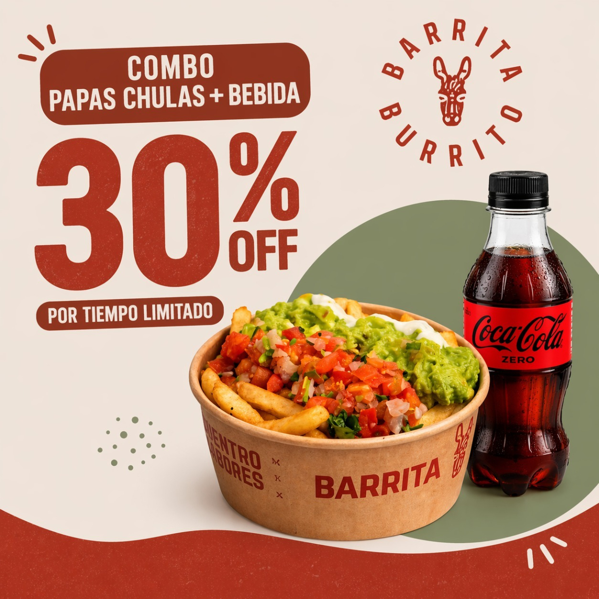 1 Papas chulas (chili, pollo o costilla) más un burrito (chili, pollo o costilla BBQ dulce) con todos los ingredientes de la barra más 1 bebida 250 ml..