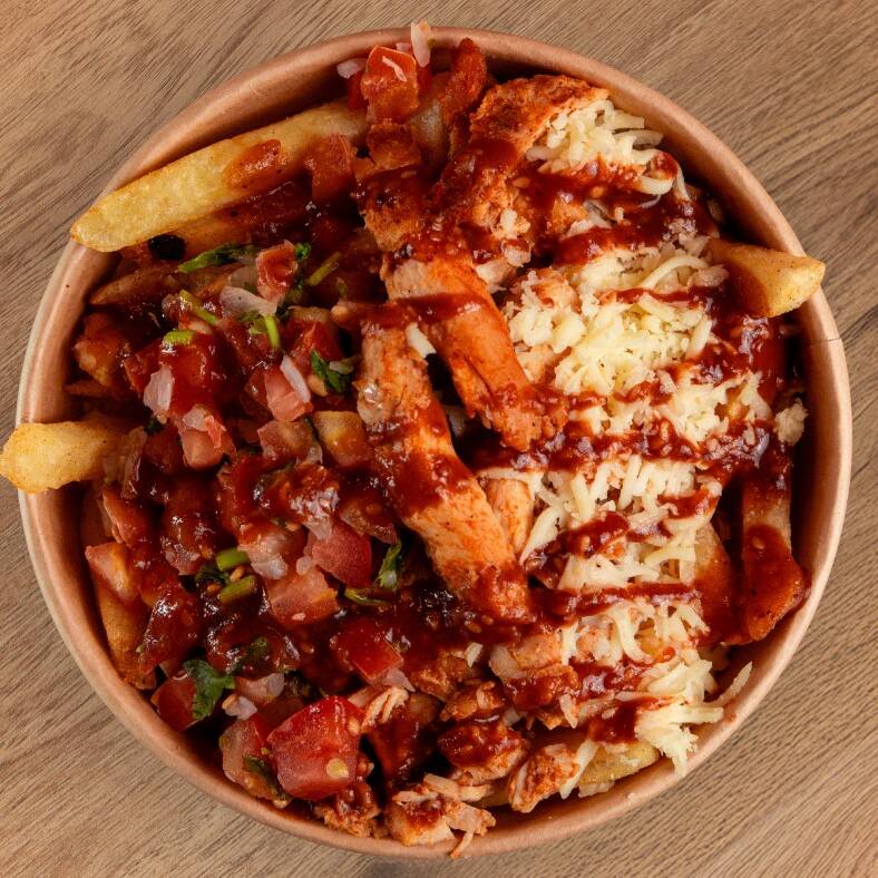Una mezcla de papas a la francesa, pollo a la plancha, salsa BBQ chipotle, pico de gallo y queso mozzarella.