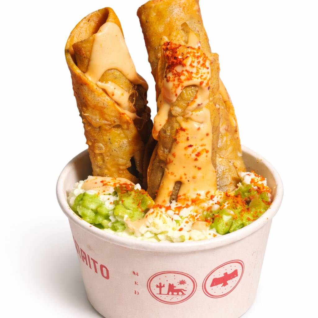 Crujientes flautas doradas, servidas sobre una deliciosa cama de guacamole, queso, sour cream y otros ingredientes.