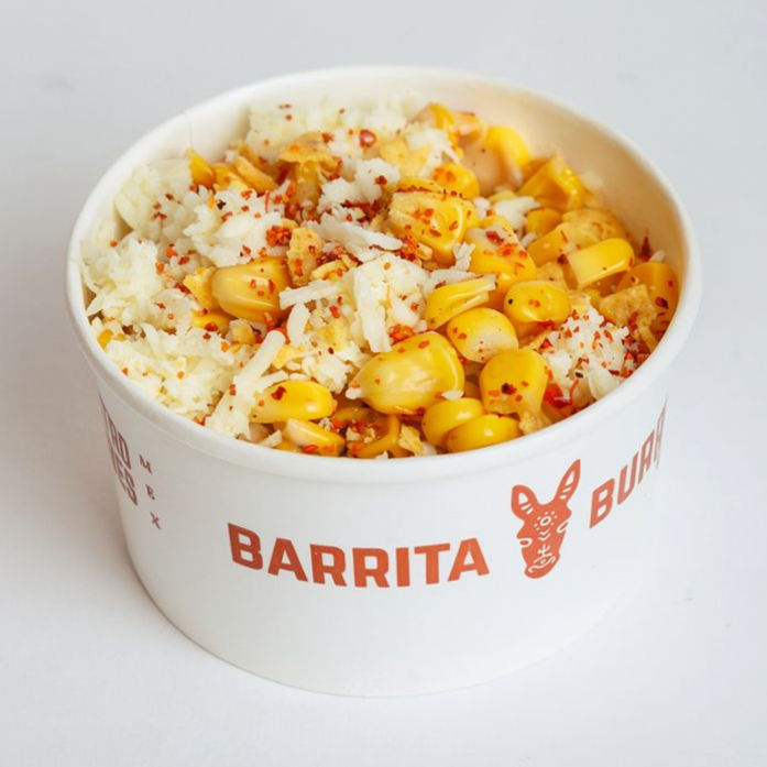 Mezcla de maíz desgranado, bañado en mayo chipotle, cubierto de queso mozzarella, tajín y crocante de nachos.