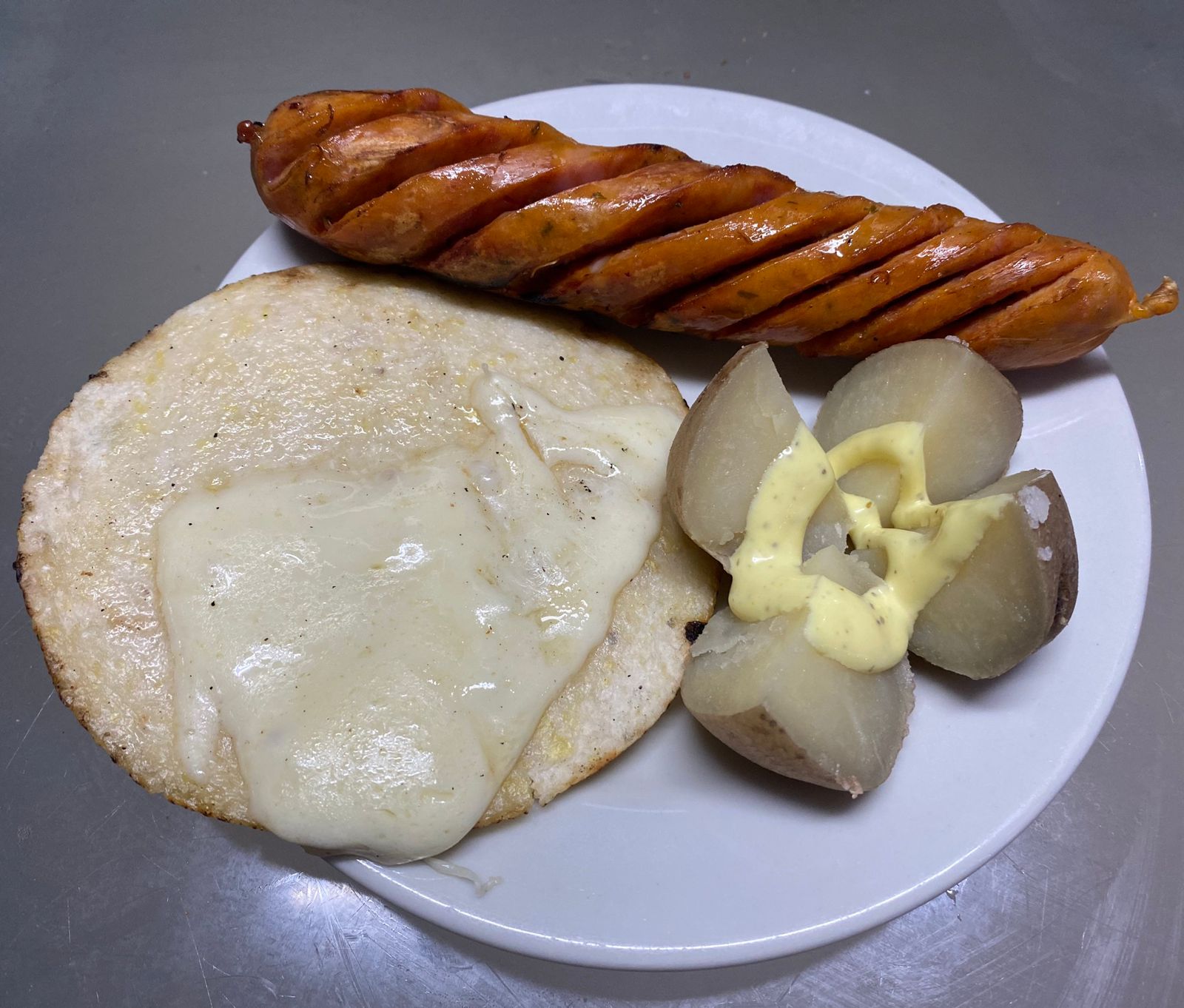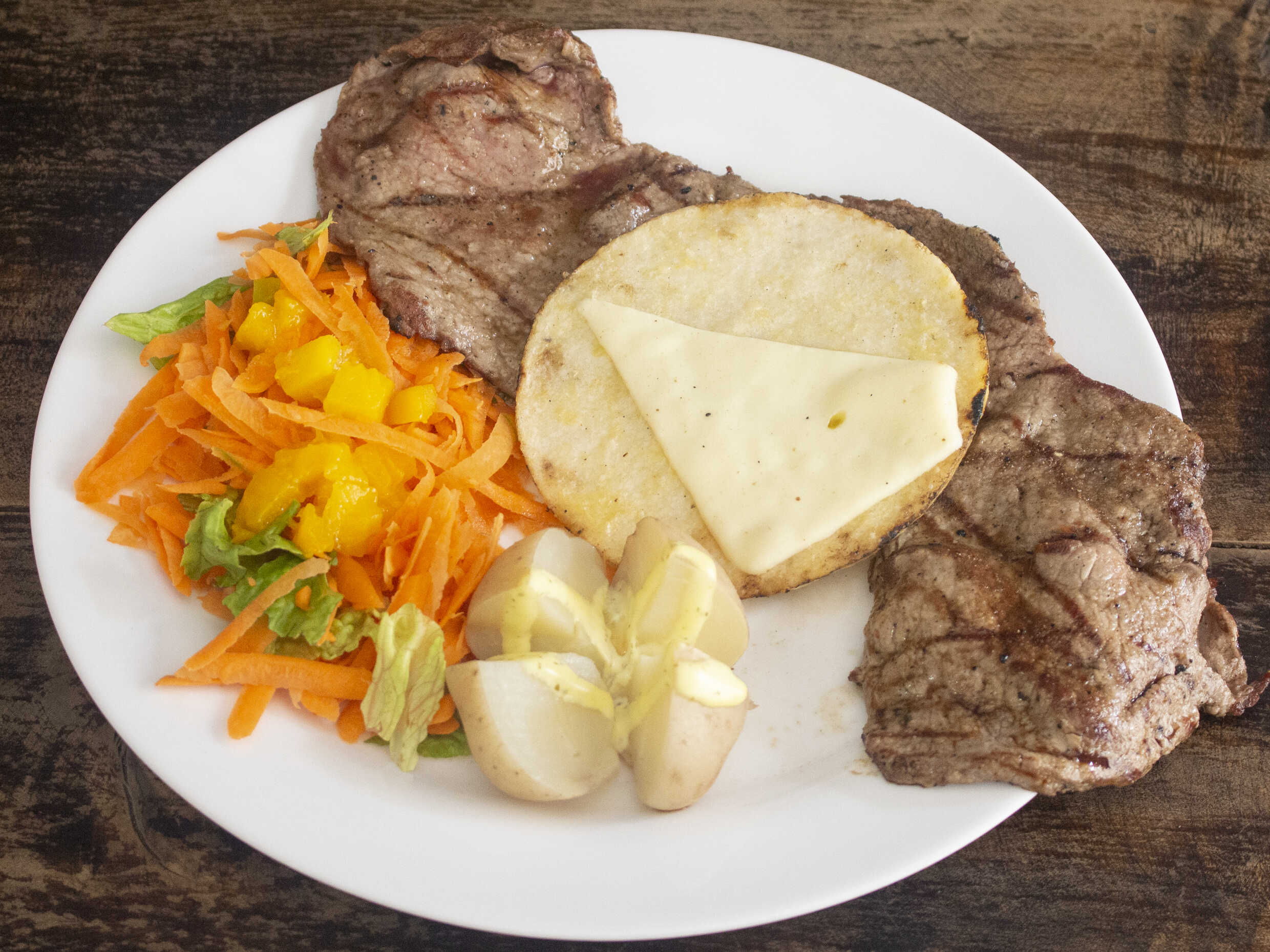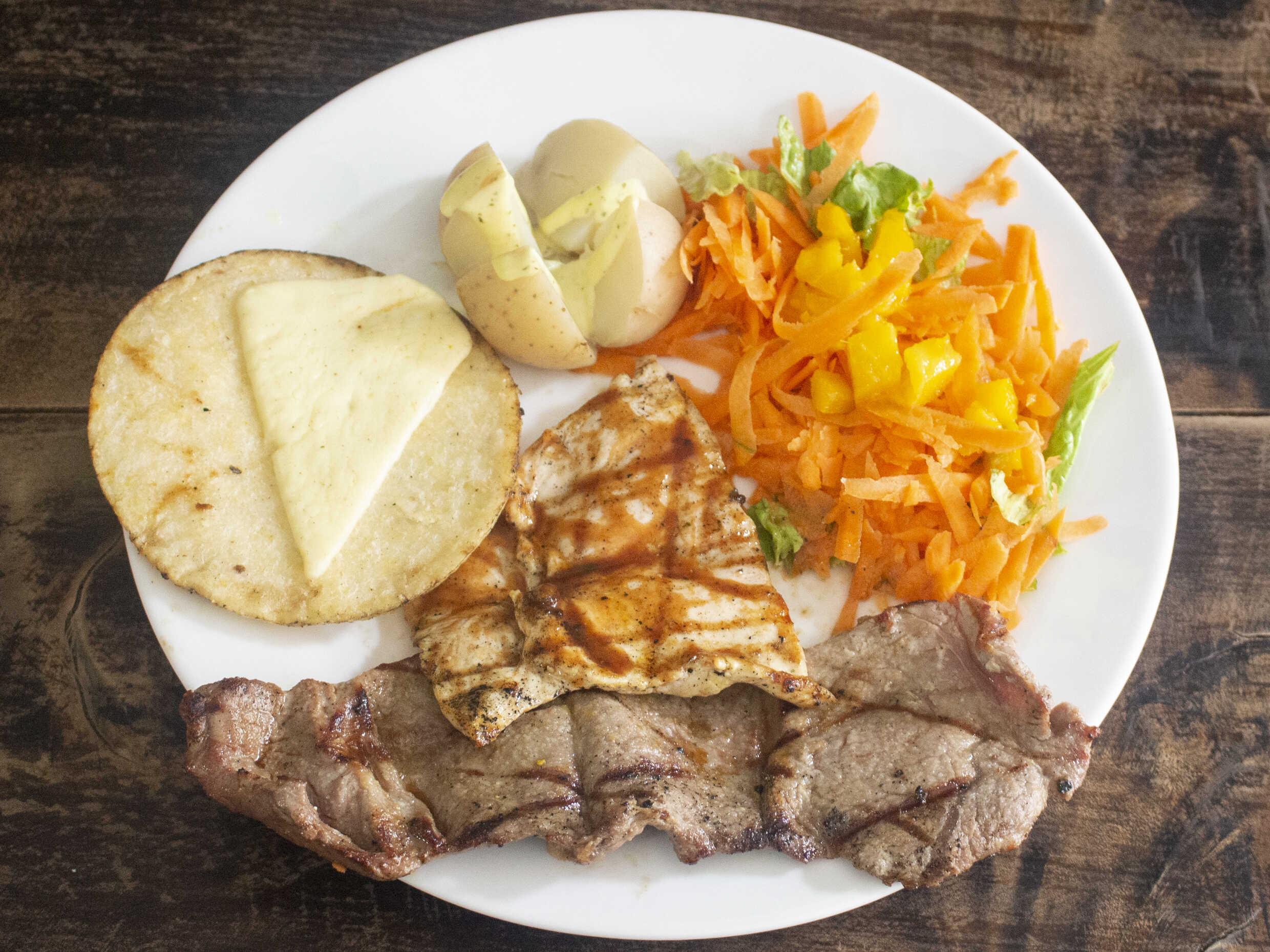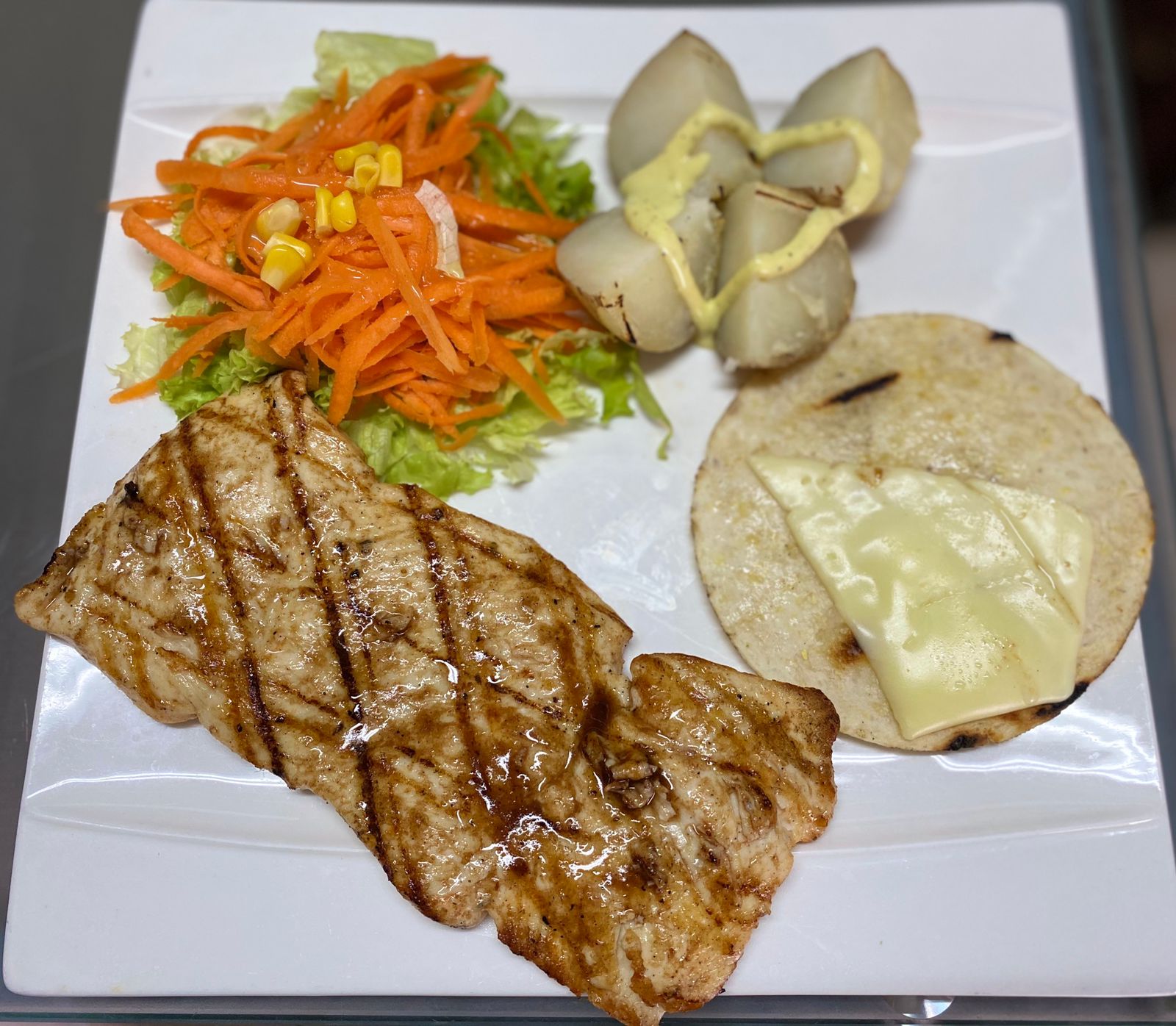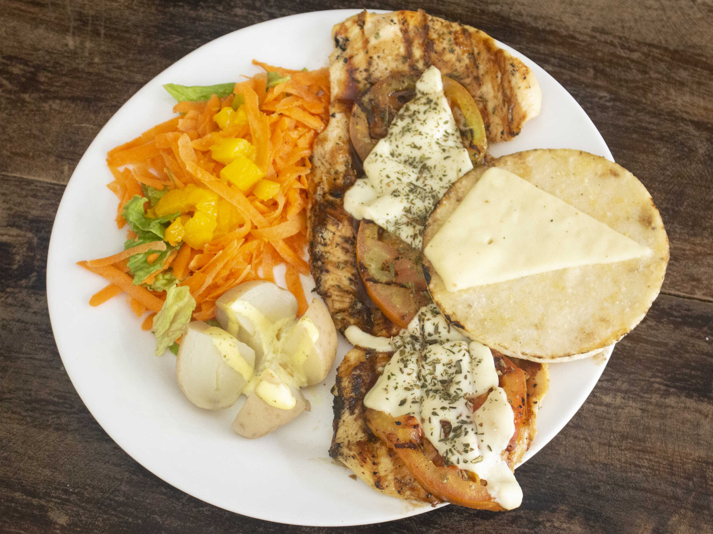 Filete con queso, tomate, pimienta y orégano, acompañado con ensalada, papa cocida y arepa con queso mozzarella.