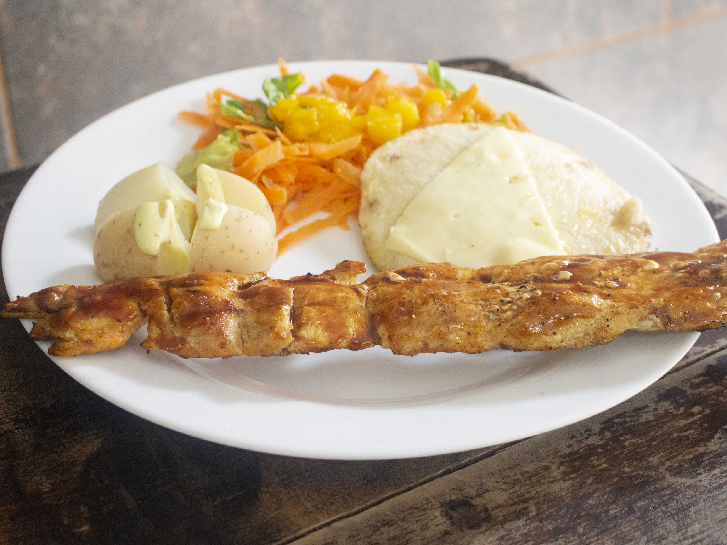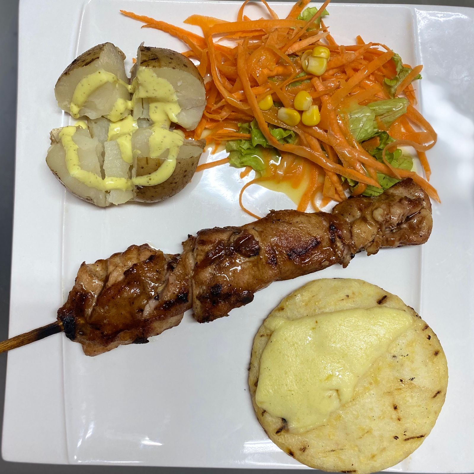 Acompañado con ensalada, papa cocida y arepa con queso mozzarella.