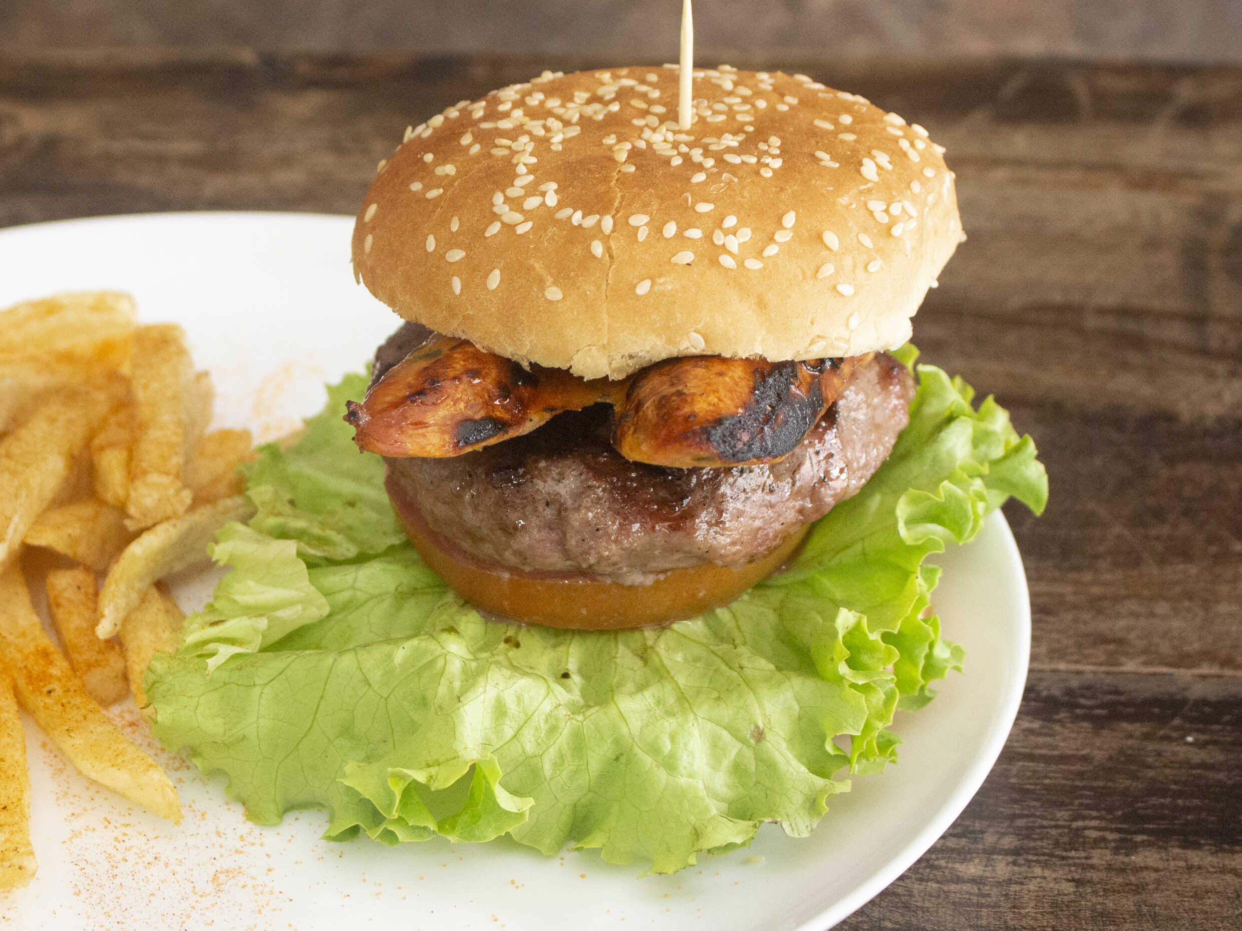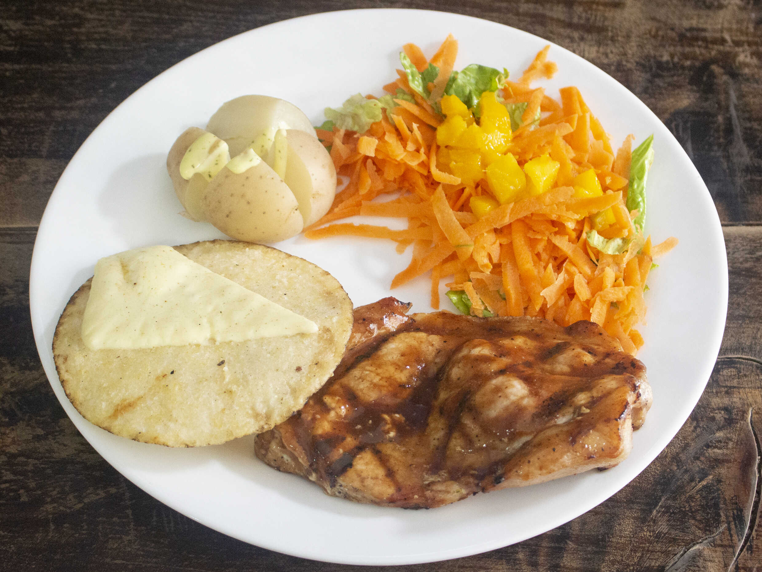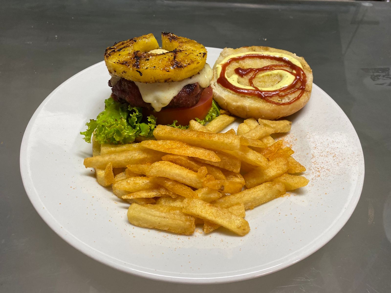 Piña asada, papa a la francesa, lechuga, tomate, cebolla.