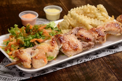 Chuzo de pollo de 250 g acompañado de papas (a la francesa o al vapor), ensalada fresca y arepa.