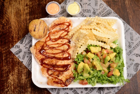 Pechuga de pollo a la plancha, papa al vapor o francesa, ensalada fresca y arepa.
