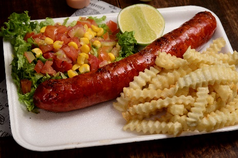 Delicioso chorizo de cerdo, acompañado de papas a la francesa, ensalada fresca y arepa.
