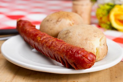 Delicioso chorizo de cerdo, acompañado de papa al vapor y arepa.