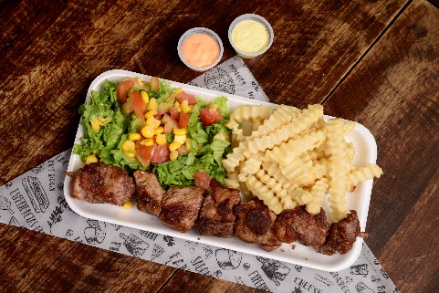 Chuzo de solomito de cerdo acompañado de papas (a la francesa o al vapor), ensalada fresca y arepa.