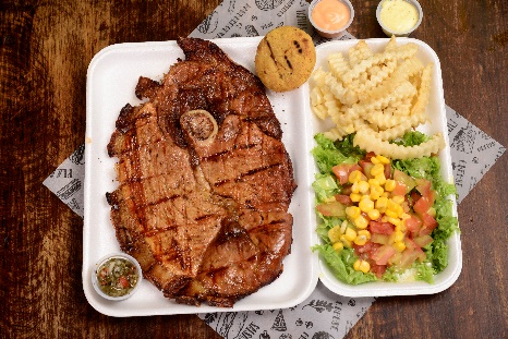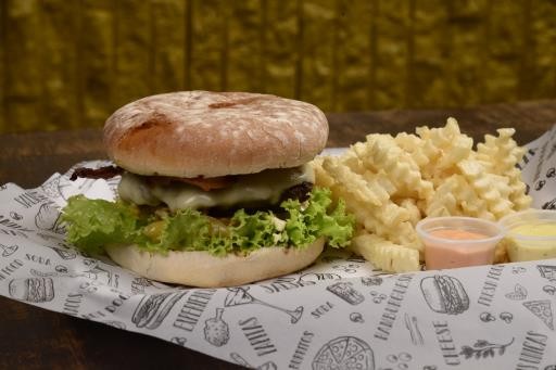 Deliciosa carne de res preparada en casa, acompañada de tocineta ahumada, pan artesano, queso, vegetales, papa a la francesa y salsa de la casa.