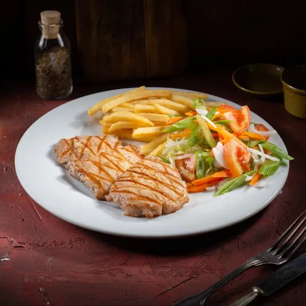 Chuleta de cerdo acompañada de papa francesa o al vapor, ensalada fresca y arepa.