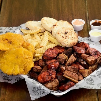 Deliciosa mezcla de carnes de res y cerdo, chicharrón, chorizo, papas a la francesa, patacones y arepitas.