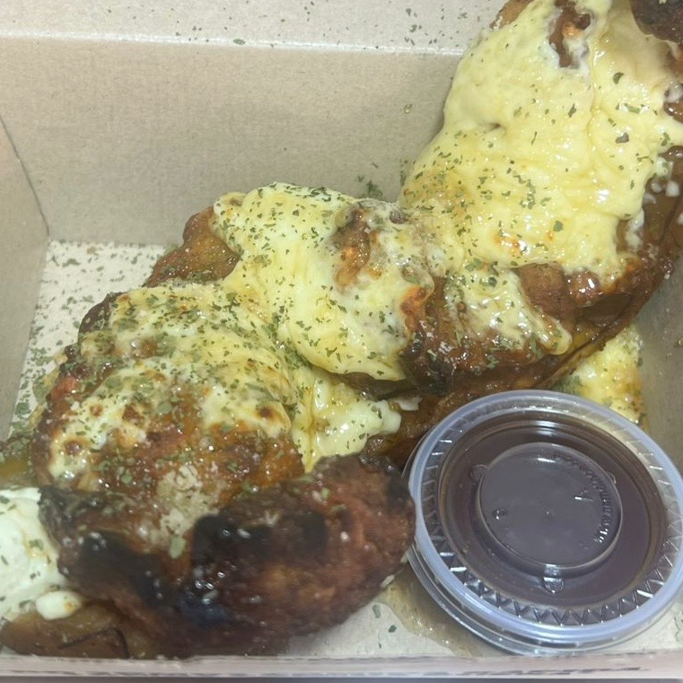 Platano Maduro frito perfectamente, relleno de queso philadelphia, PolloCrispy, Queso mozzarella y horneado. terminado con queso parmesano y Miel/syrup