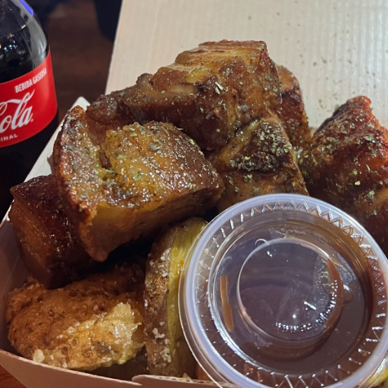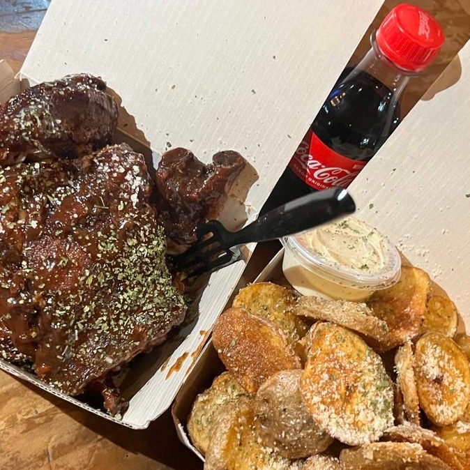 PorkBelly "2Veces" es nuestro Barriguero apana Lata costilla 2 Veces son todos los recortes de costilla sazonadas y horneado a fuego lento- después frito a perfección y bañado en BBQ Hecho en casa. Incluye "Papas Big Boy" (Horneadas con cascara, medallones gruesas y fritas (SON DORADAS)-Incluye 1 Salsa de Ajo