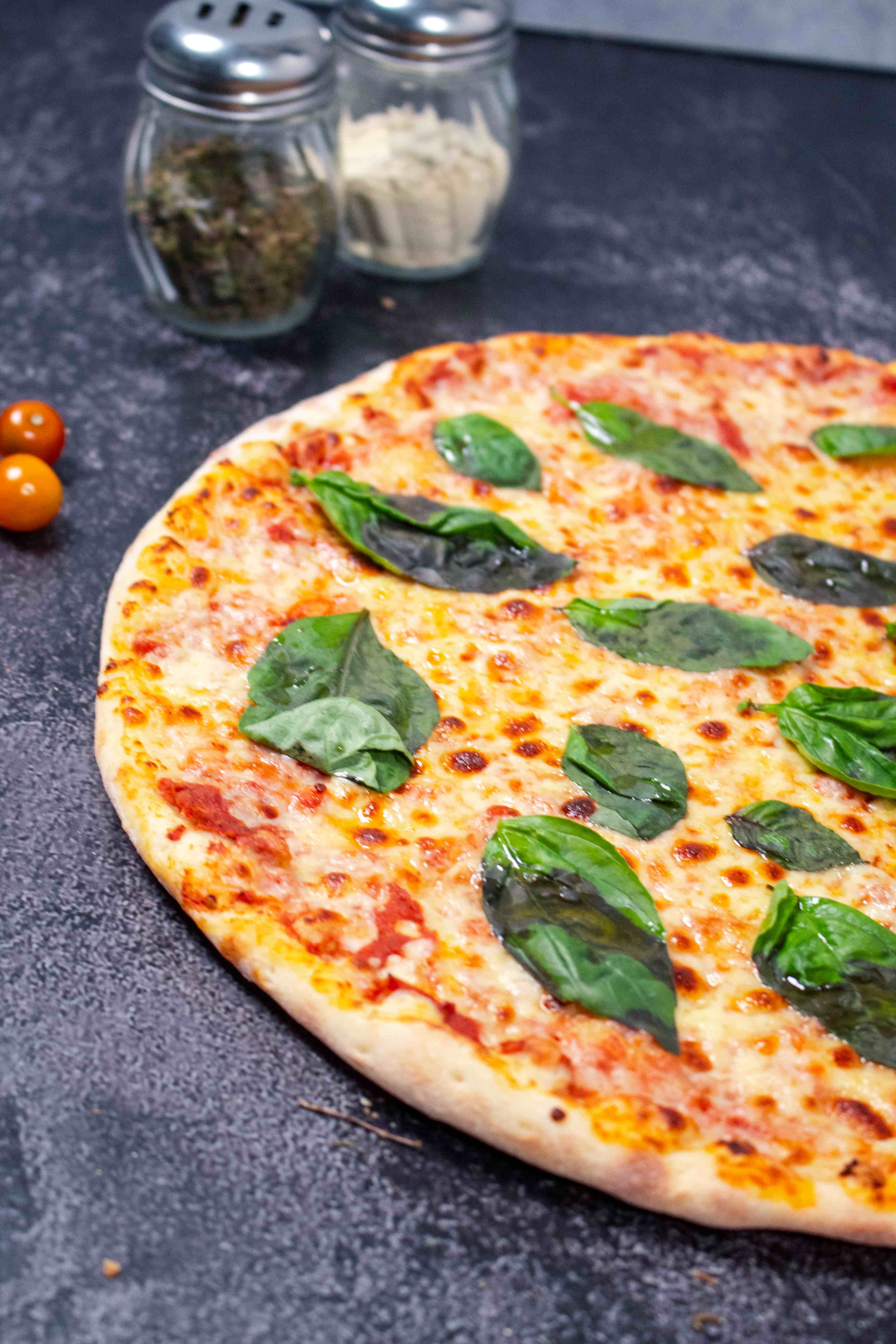 La pizza que evoca los colores de la bandera italiana. Bigzza ofrece una excelente versión con queso mozzarella, tomates frescos San Marzano y un toque de albahaca.