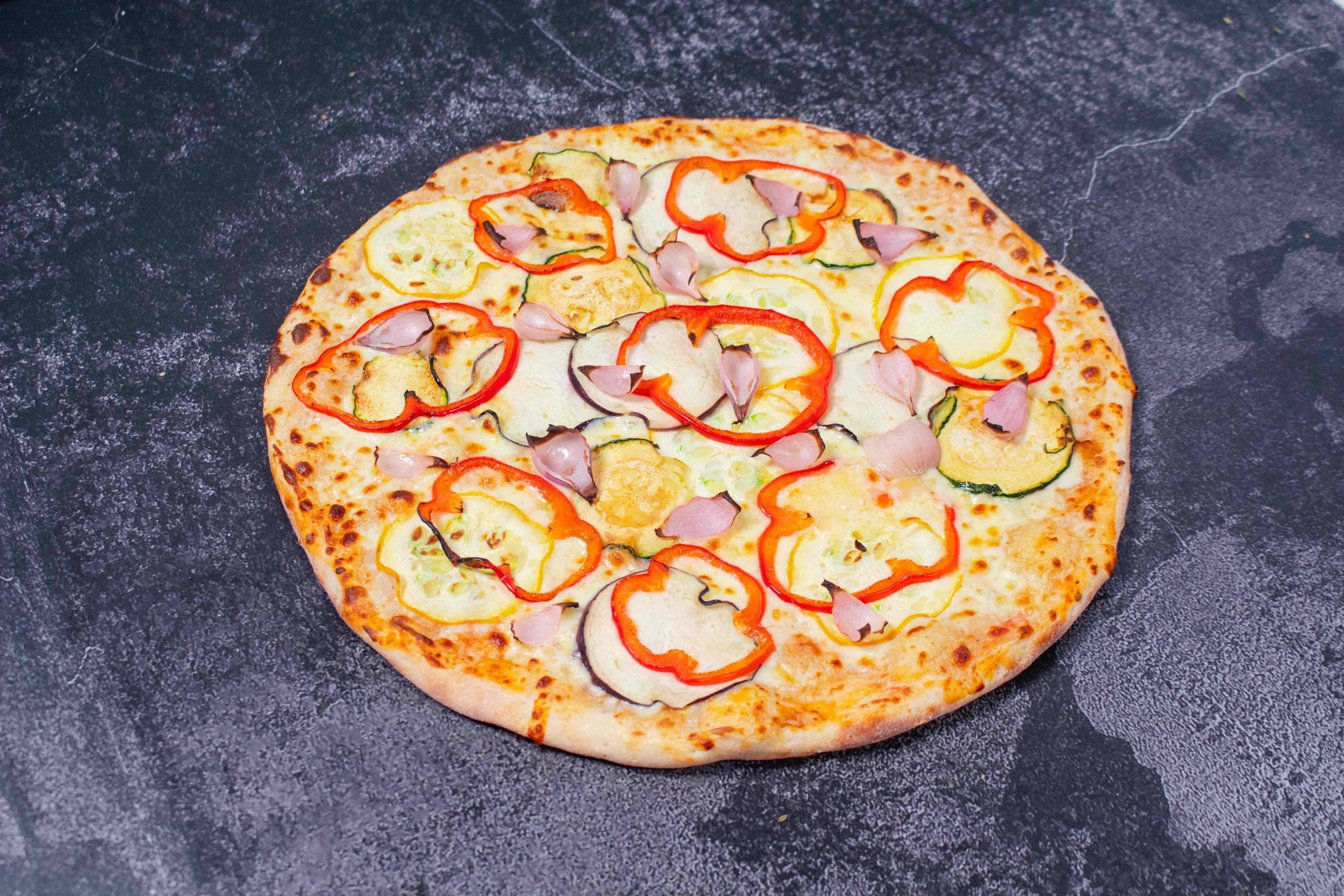 Pizza small de 4 porciones. Descubre nuestra opcion vegetariana inspirada en la tradicion fancesa de Bigzza. Con base pomodoro artesanal y frescos vegetales como zucchini, pimenton rojo, champiñones, cebollas ocañeras y tomates deshidratados, personaliza tu pizza con la base que elijas y un toque de oregano opcional.