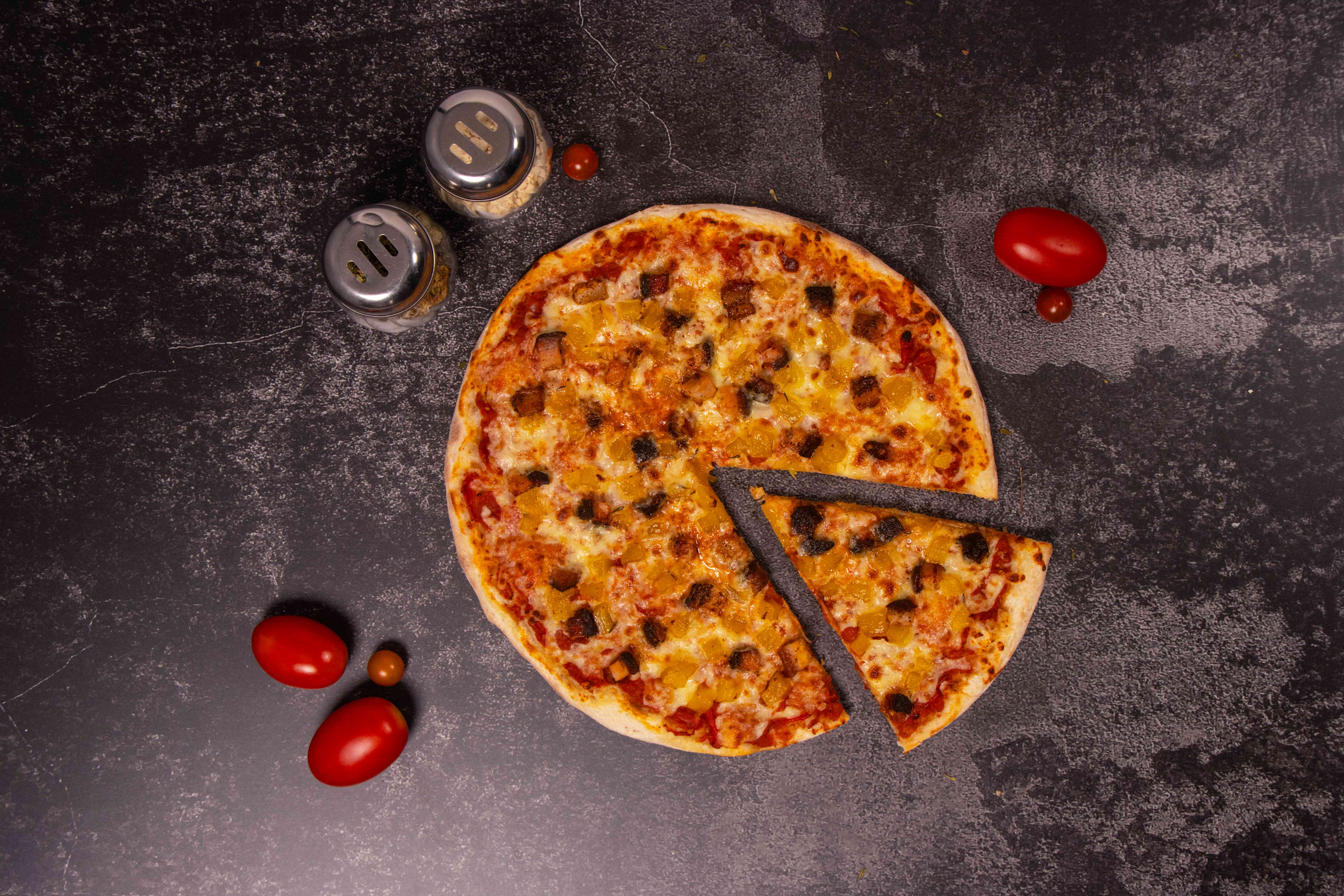 Nuestra versión hawaiana: trozos de chicharrón ahumado con un sabor intenso y piña oro miel en almíbar de vino blanco. Una receta muy Bigzza. ¡Te sorprenderá!
