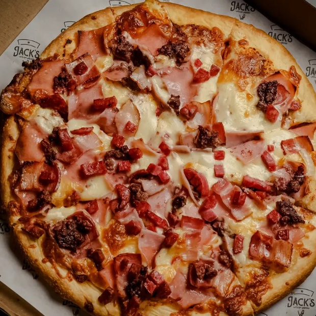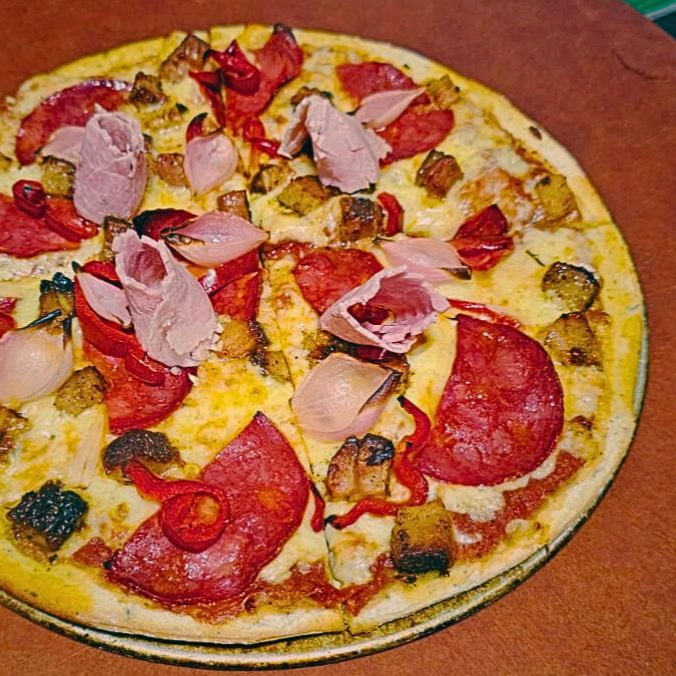 ¡Nuestra especialidad irresistible! Pepperoni, salami, jamón y trozos de chicharrón ahumado sobre una base de pomodoro y nuestra deliciosa masa artesanal. ¡Te encantará!