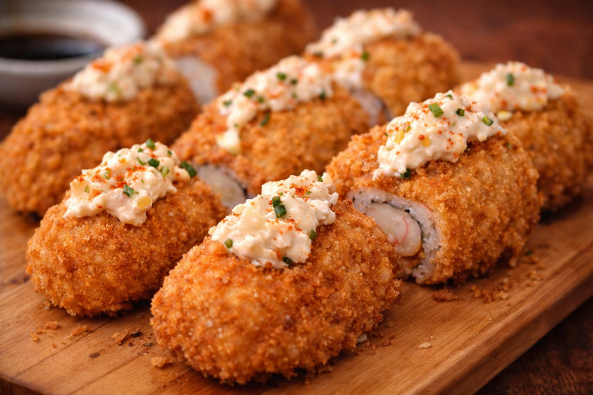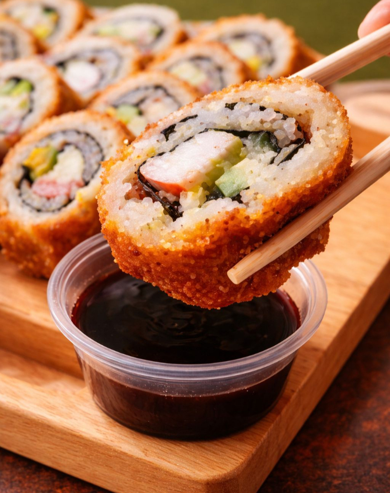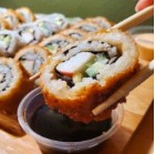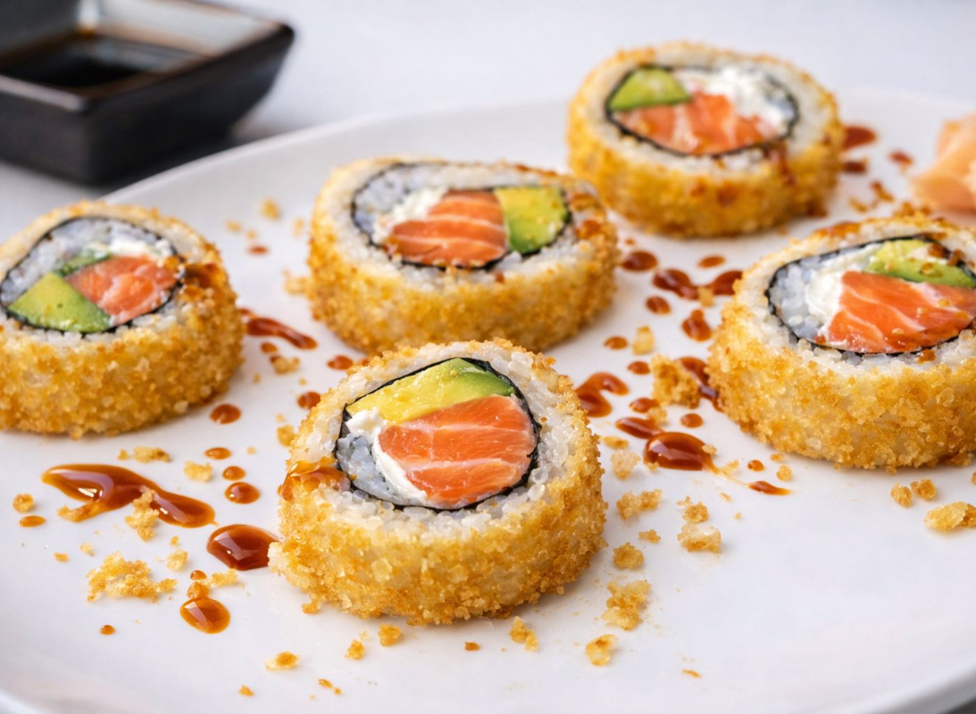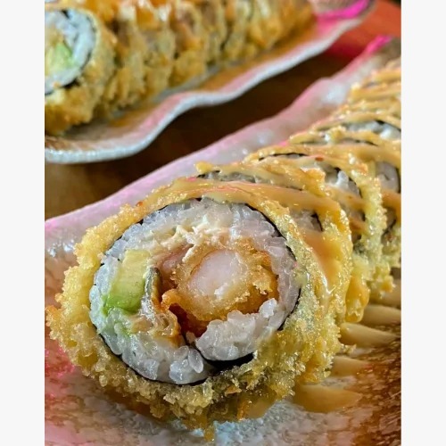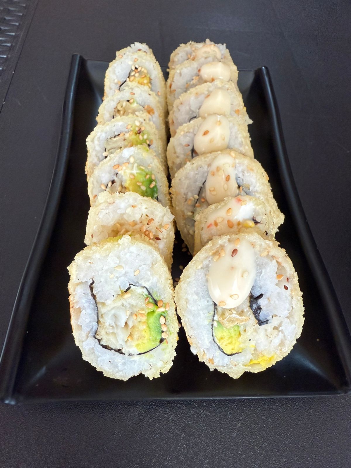 10 uds Sushi de langostino tempura, queso crema y aguacate, envuelto en plátano maduro.