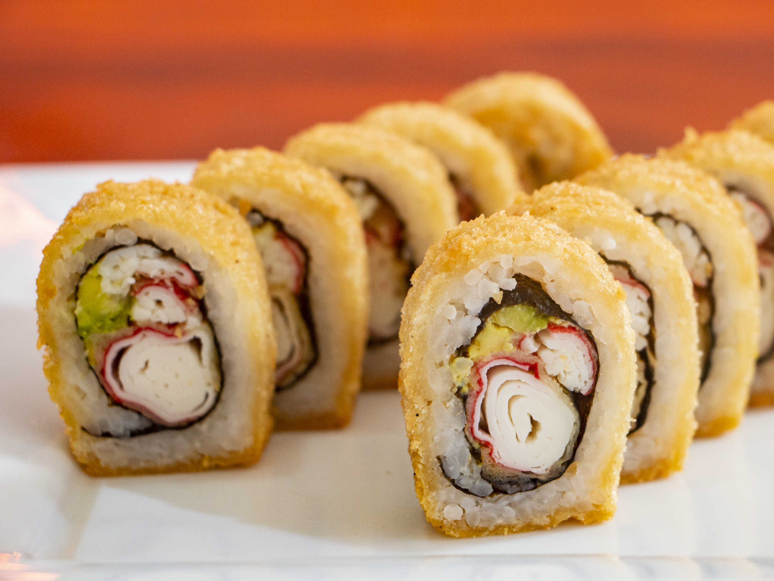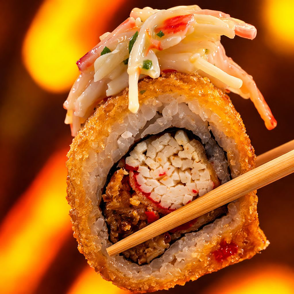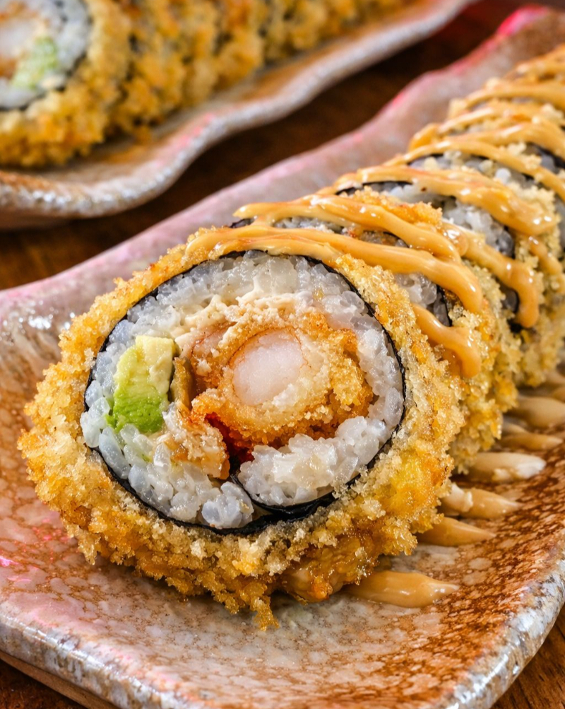 Espectacular rollo, de 10 bocados, rellenos de queso crema, aguacate y palmito de cangrejo, todo apanado, bañado en salsa de la casa.