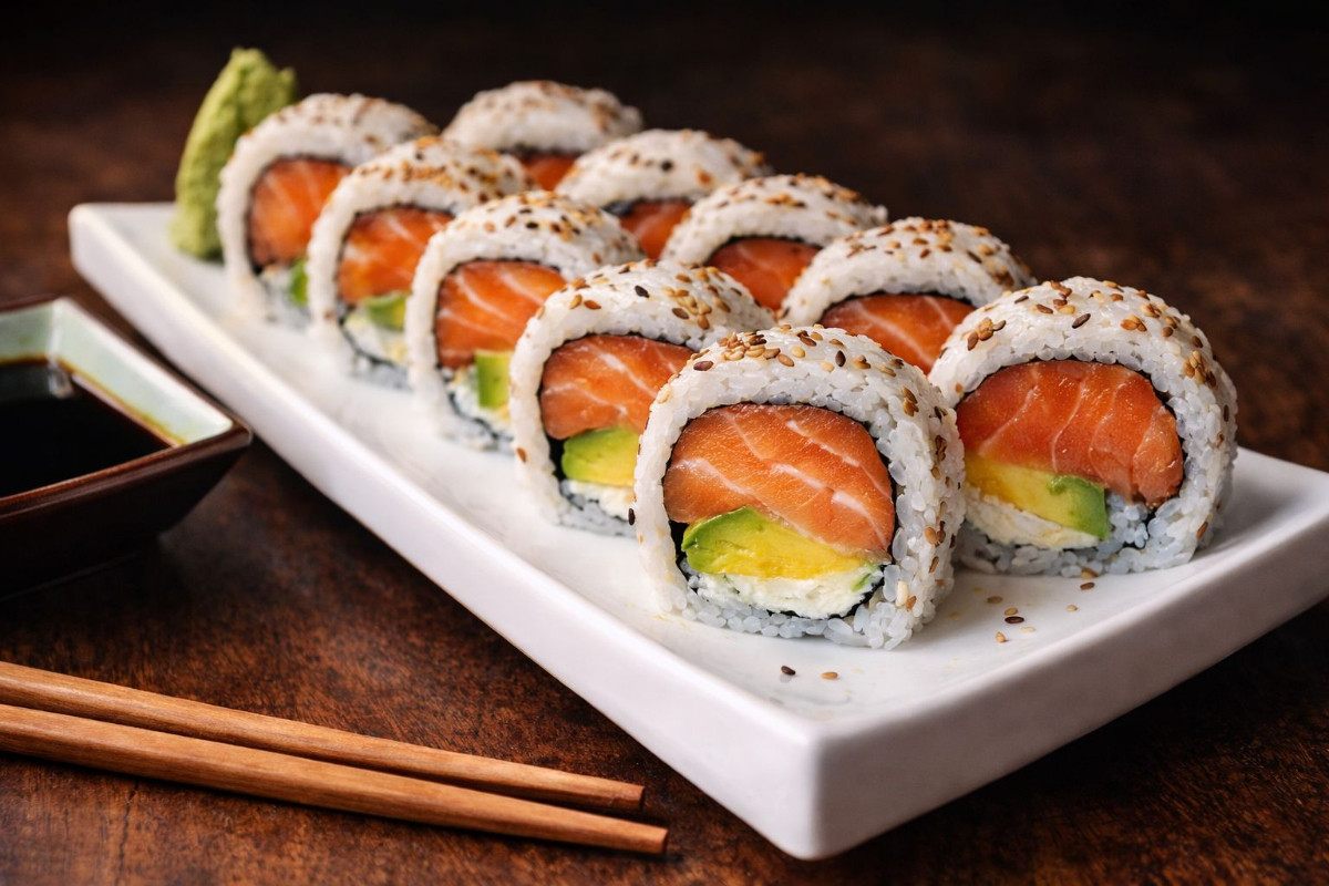 Alga nori, arroz fresco de sushi, aguacate, y salmón