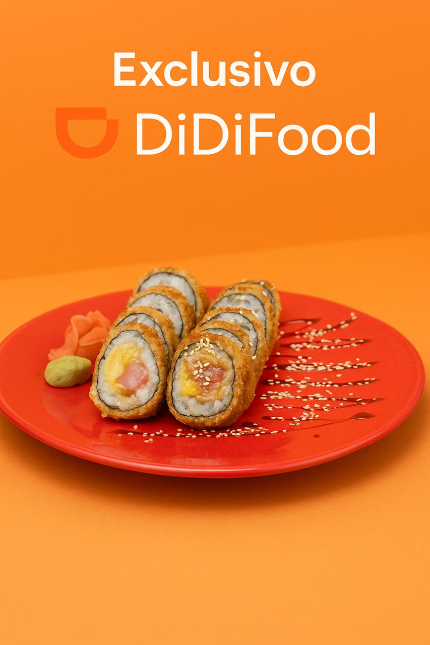 Espectacular rollo, de 10 bocados, rellenos de queso crema, aguacate y palmito de cangrejo, coronado con tajadas de plátano maduro.(exclusivo Didi Food)