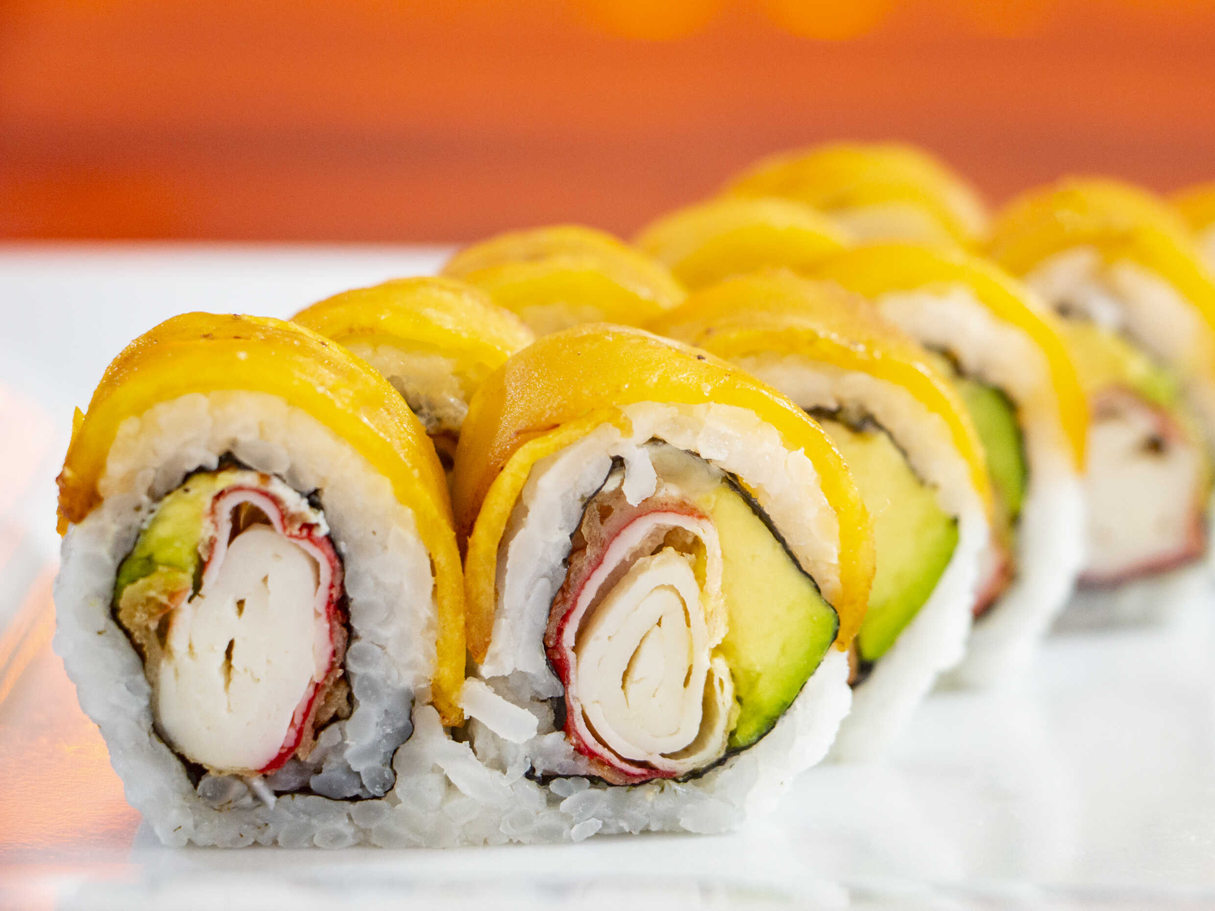 Espectacular rollo, de 10 bocados, rellenos de queso crema, aguacate y palmito de cangrejo, coronado con tajadas de plátano maduro.