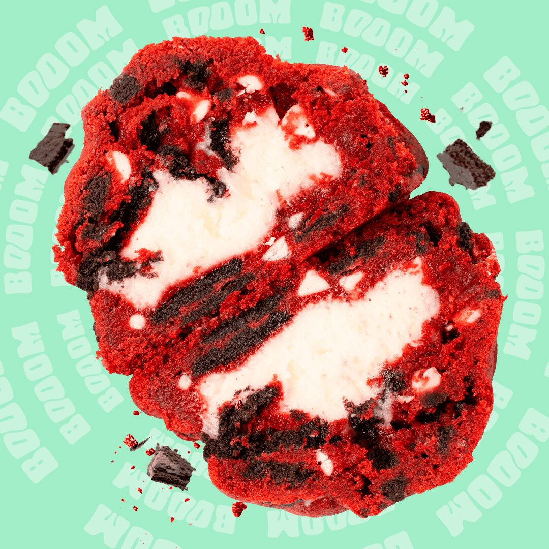 Galleta de red velvet con un toque de cacao y vainilla, rellena de queso crema con chips de chocolate blanco.