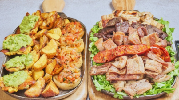 Picada para cuatro personas con surtido de res, cerdo, pollo, chorizo, papas criollas, plátano y guacamole.