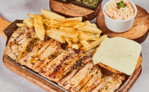 Lomo de cerdo a la parrilla, acompañado de papas a la francesa, arepa con queso y ensalada.