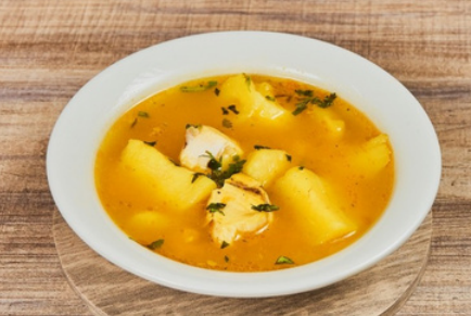 Caldo tradicional de pescado con especias, disponible en horario de 10 a 12, opción especial con arroz, ensalada, tajada y jugo.