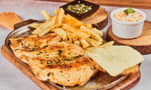 Filete de pechuga de pollo a la parrilla, acompañado de papas a la francesa, arepa con queso y ensalada.