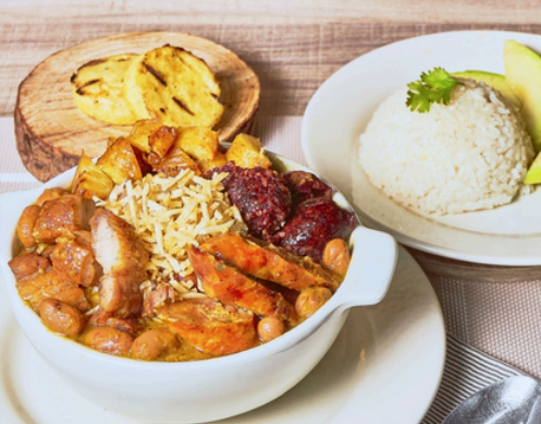 Cazuela de frijoles con chicharrón, chorizo, carne y arroz, acompañada de arepa y aguacate.