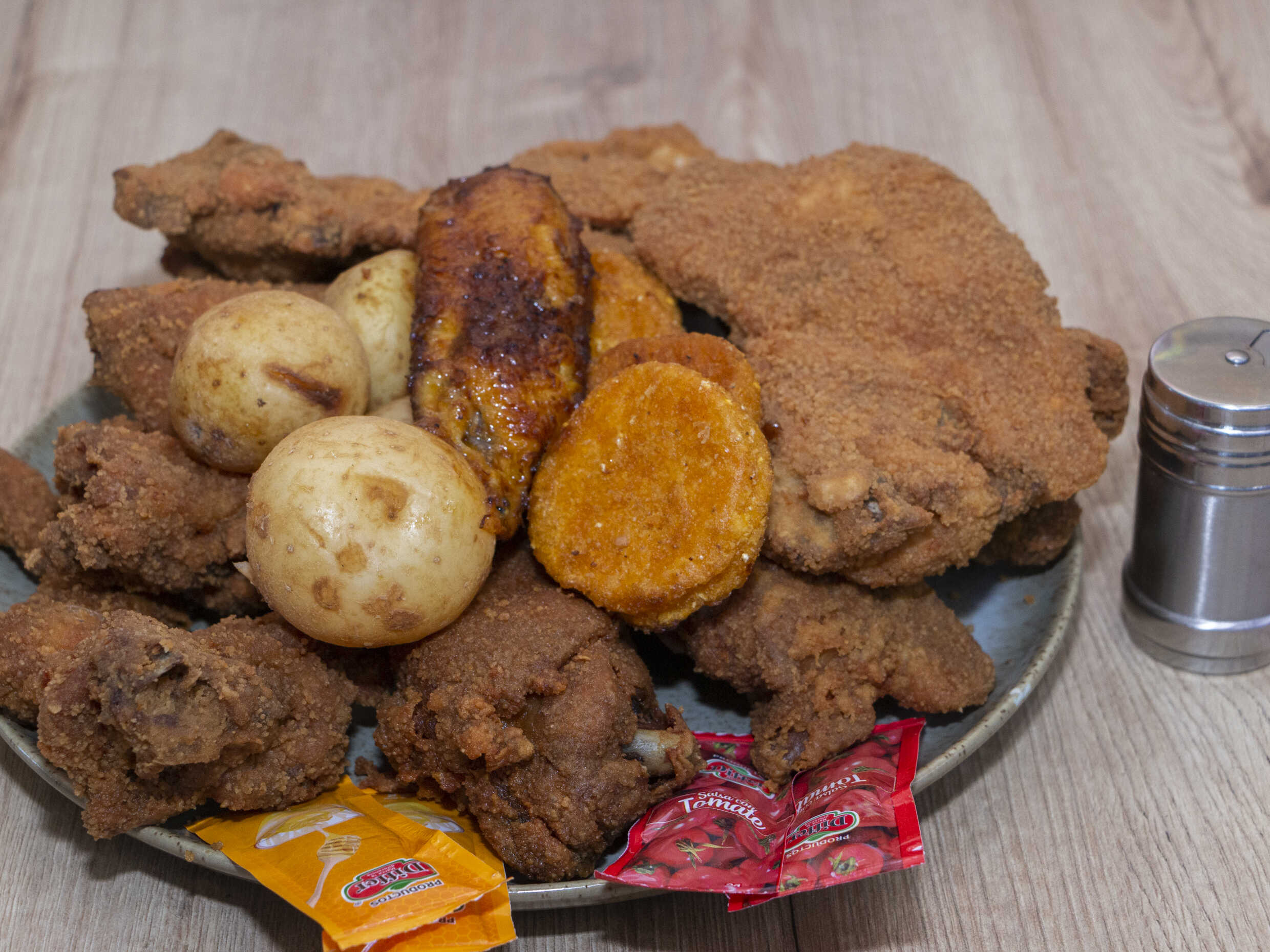 1 Pollo entero apanado, 4 arepas, 4 papas y maduro.