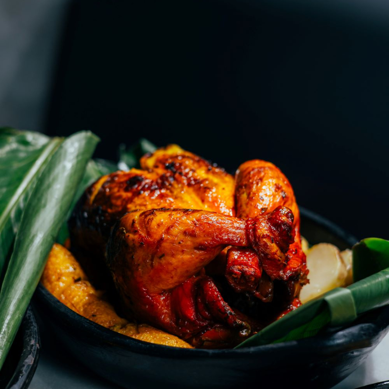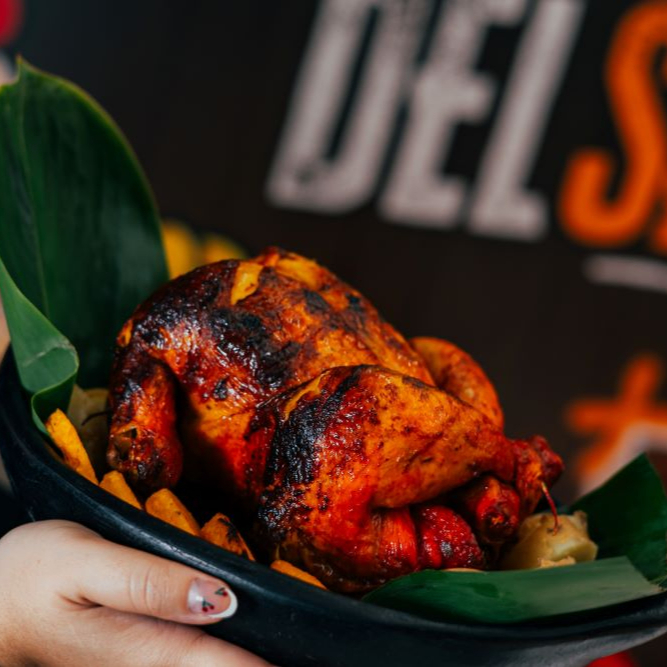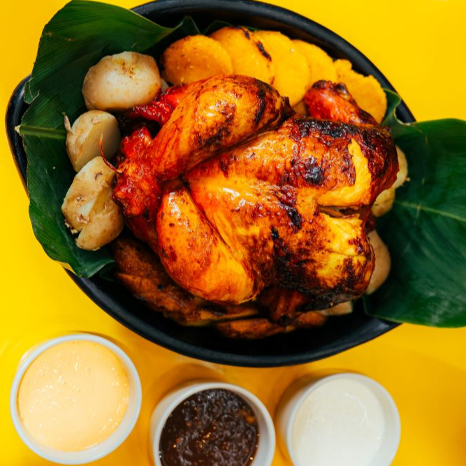 1 Pollo entero al carbón, 4 arepas, 4 papas y maduro.
