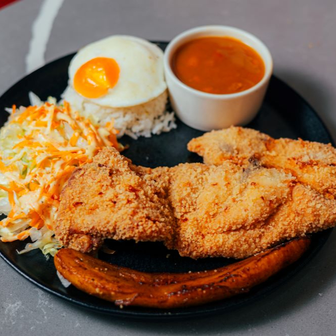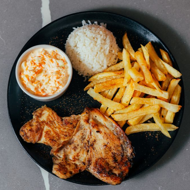 Filete de pollo de 300 g con papas a la francesa, arepa, queso y ensalada dulce.