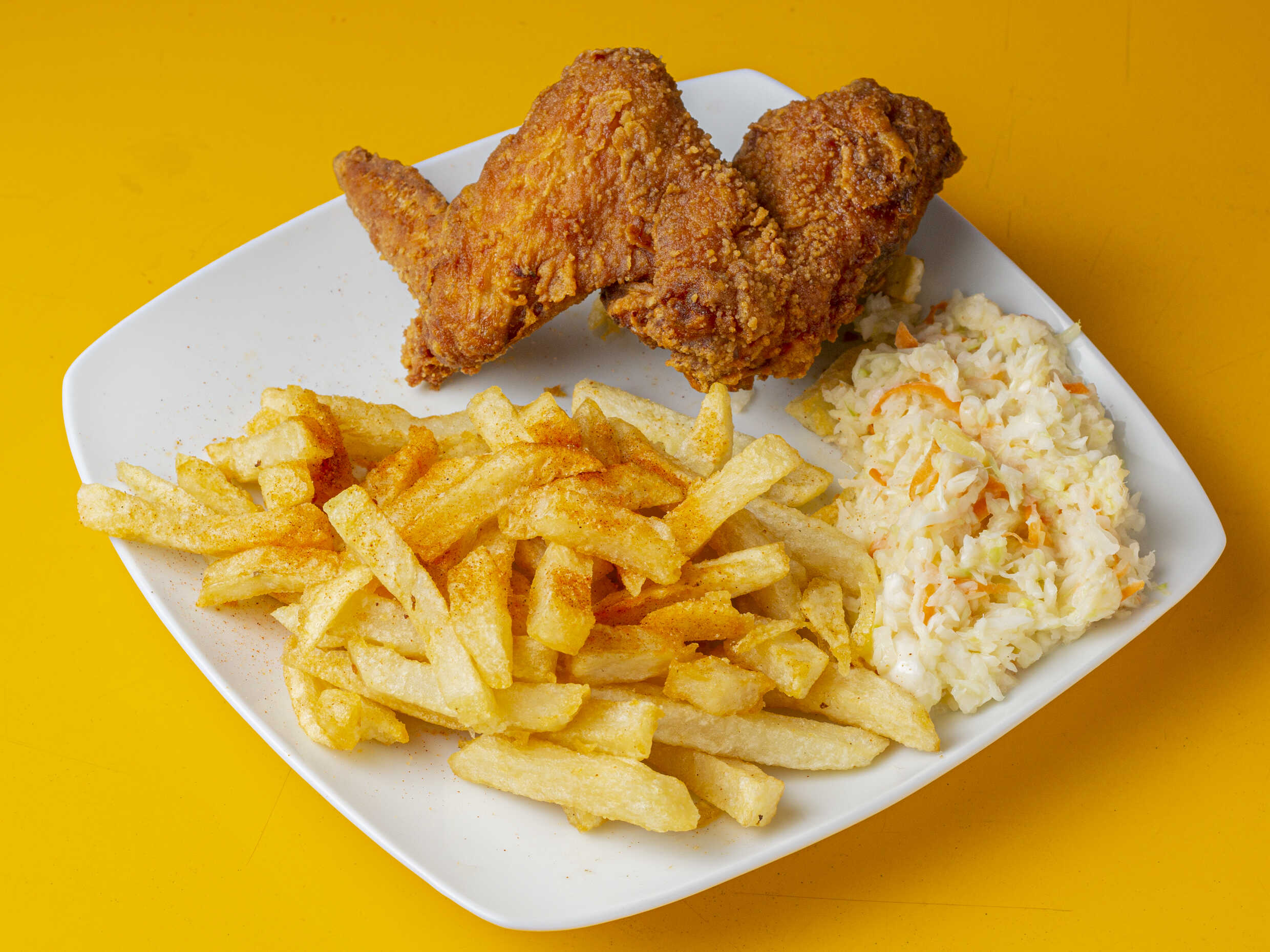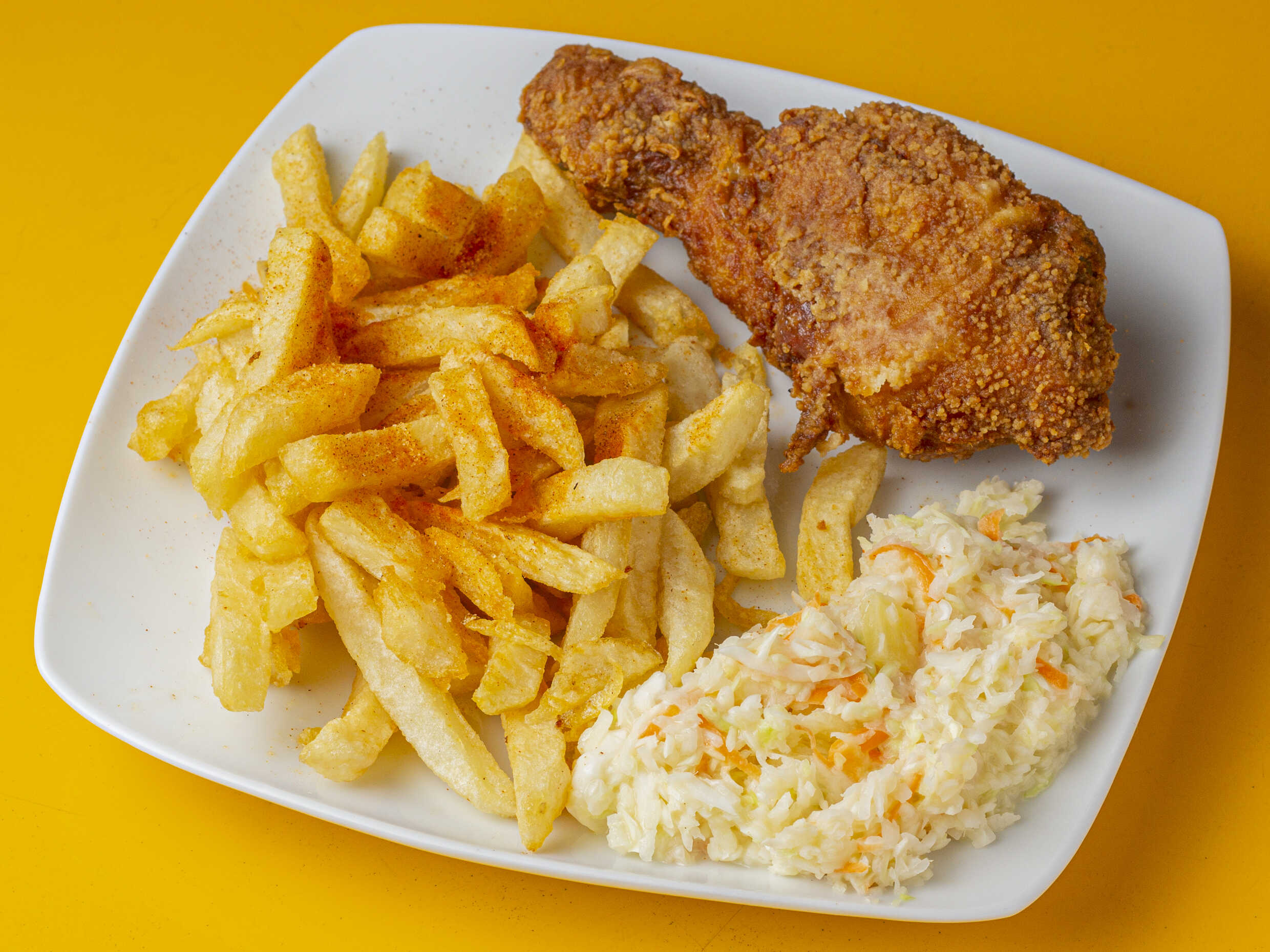 Filete de pollo de 300 gr con papas a la francesa, arepa, queso, ensalada dulce.