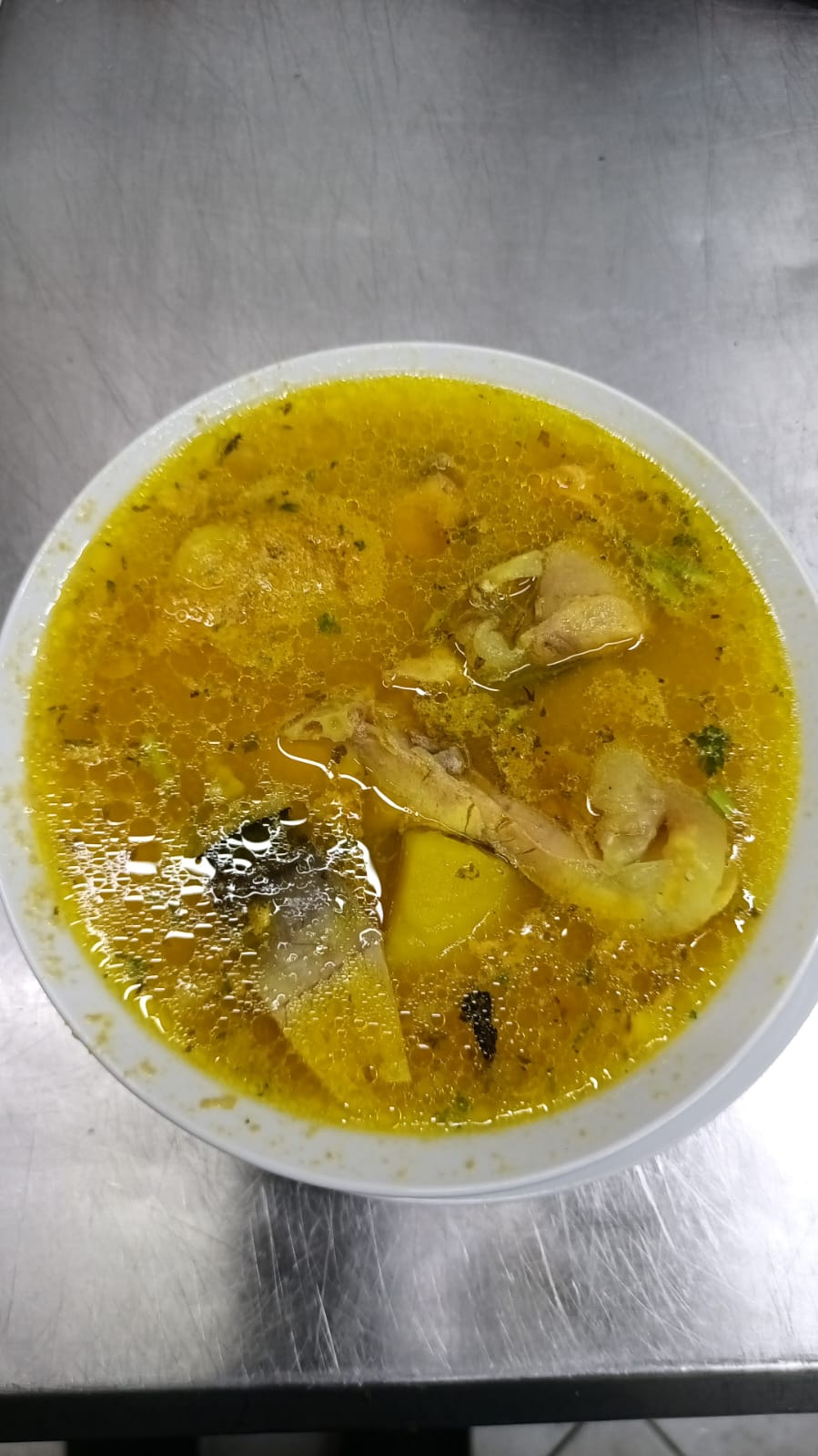 Chuzo de pollo de 300 gr con papas a la francesa, arepa, queso, ensalada dulce.