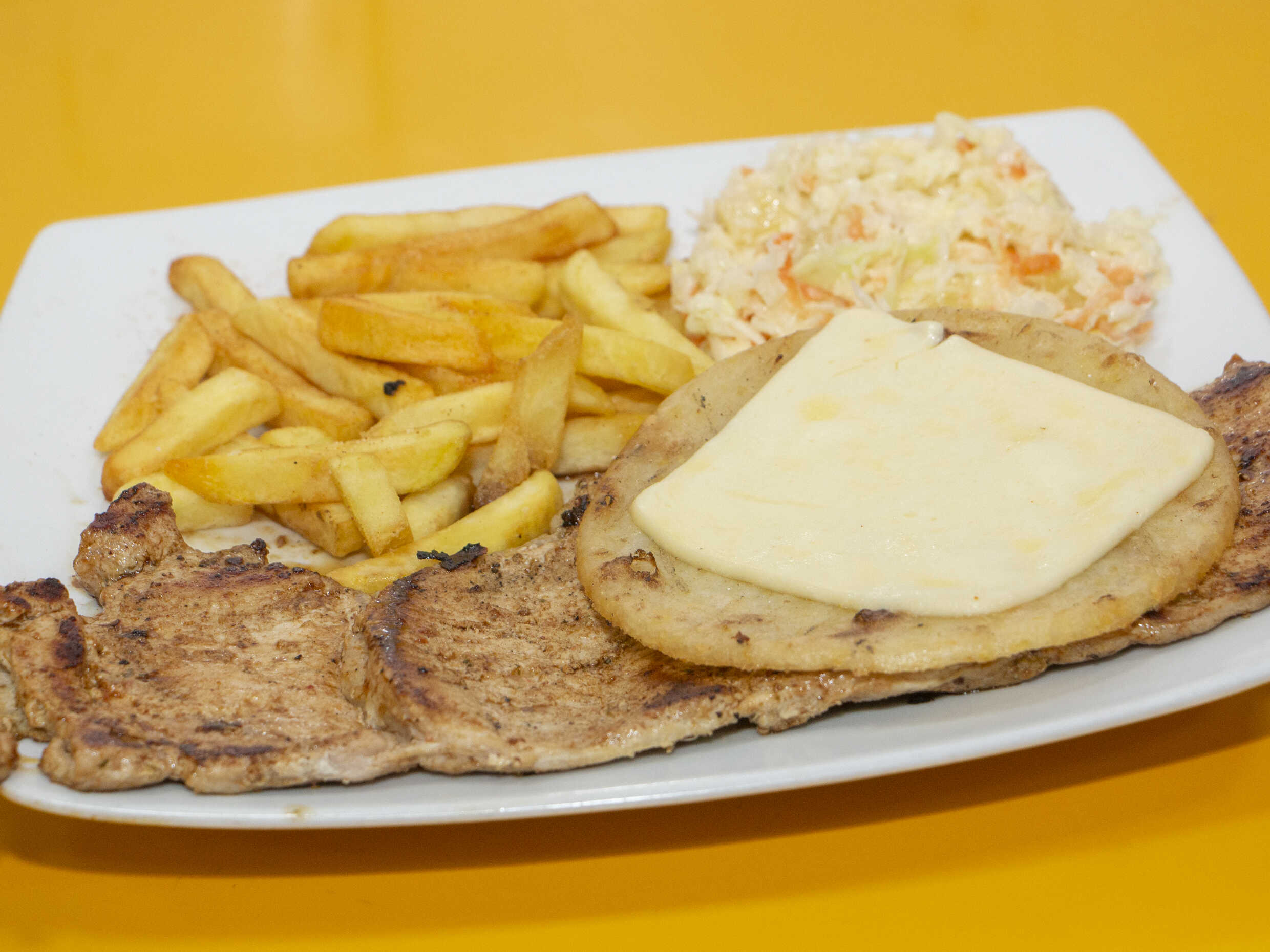 Lomo de cerdo de 300 gr con papas a la francesa, arepa, queso, ensalada dulce.