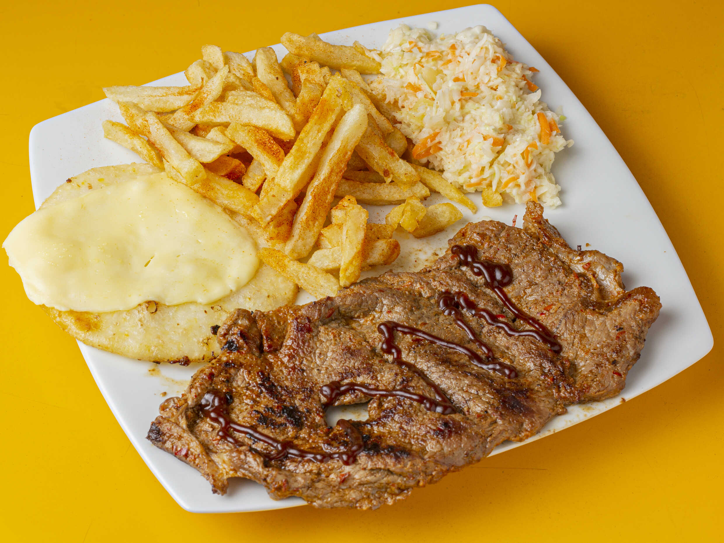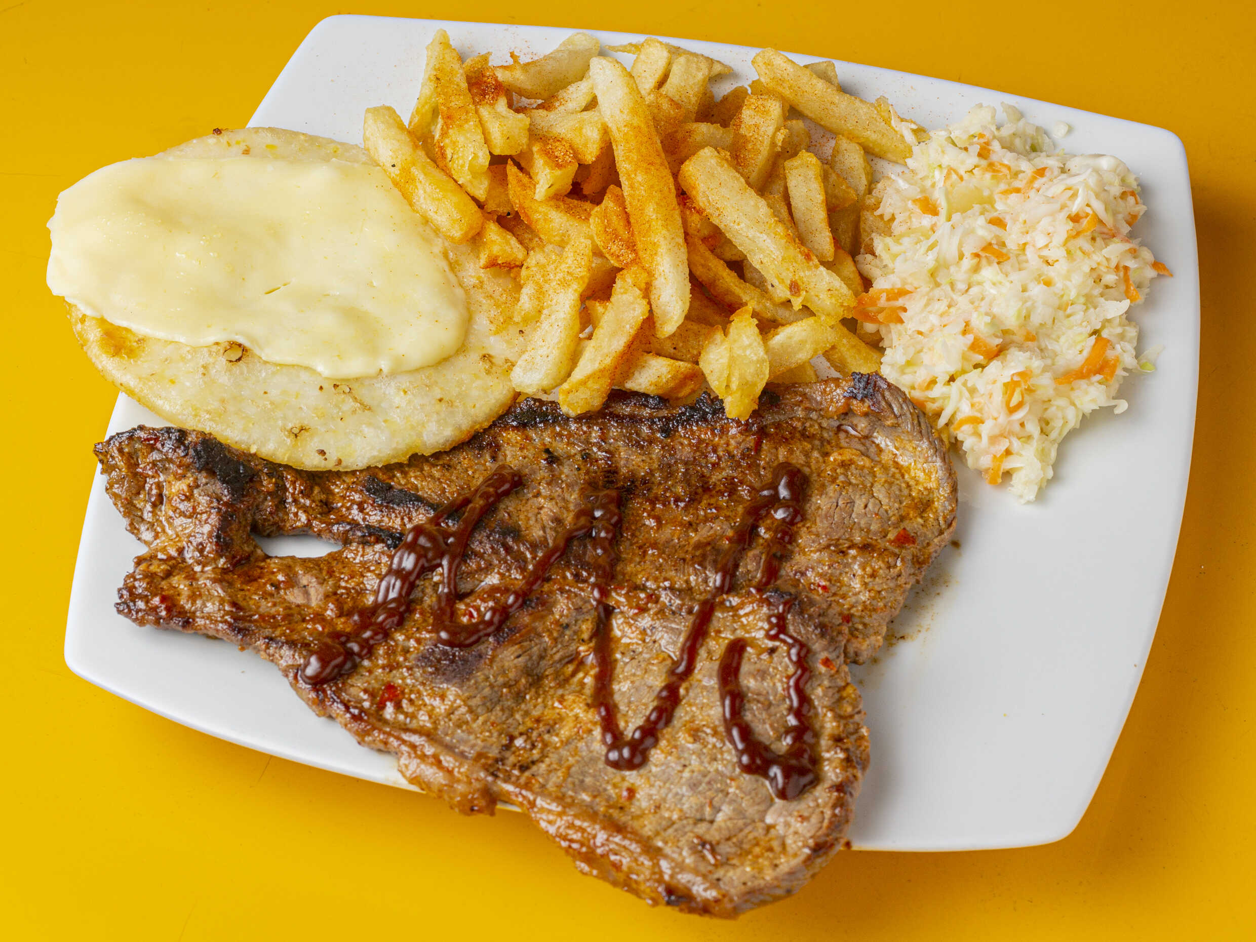 Churrasco de 300 gr con papas a la francesa, arepa, queso, ensalada dulce.