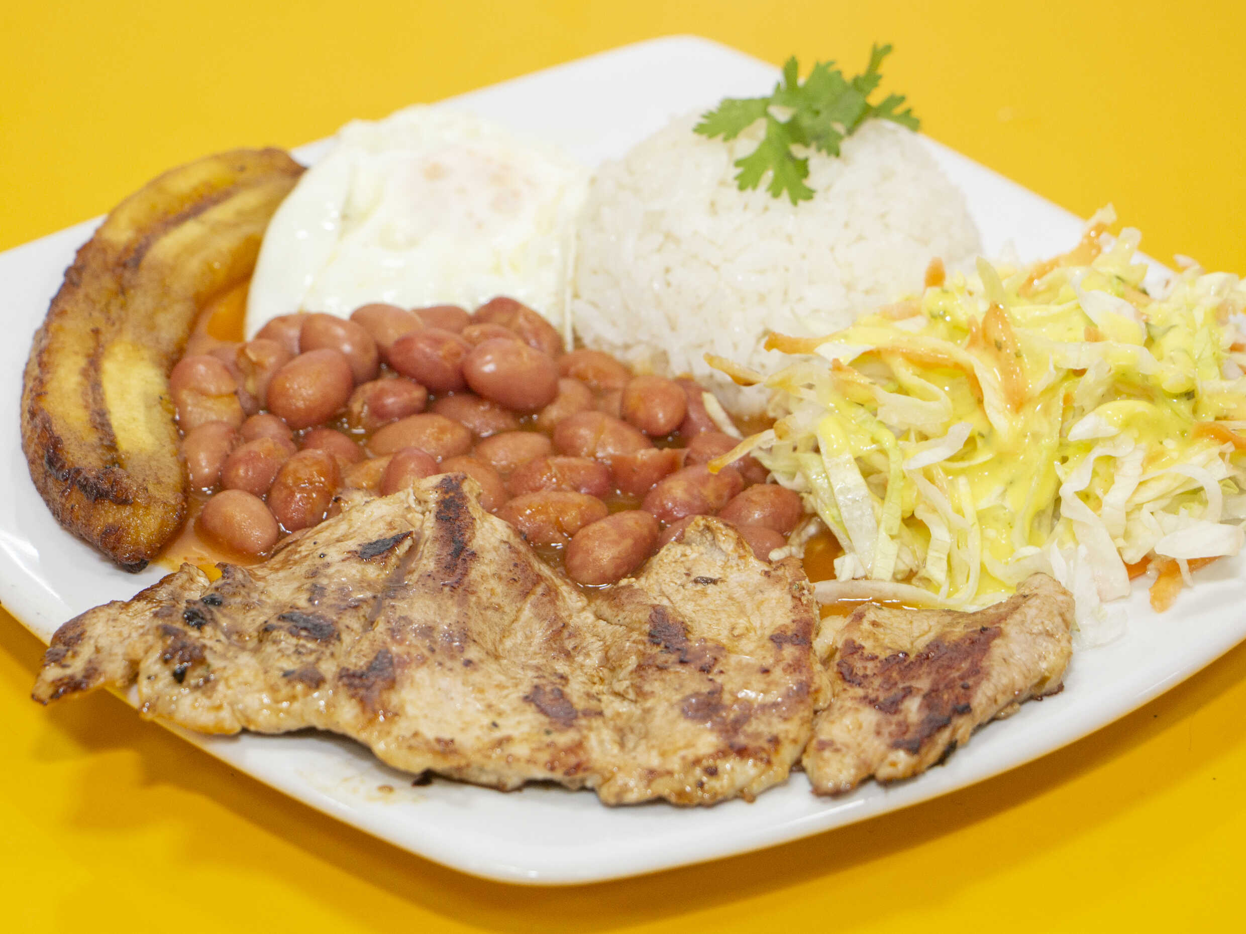 Carne a tu elección con arroz, ensalada, frijoles, tajada de maduro, 1 huevo frito, limonada.